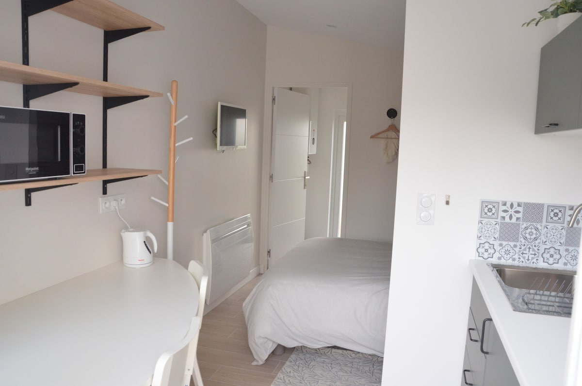 Alojamiento independiente de 16 m2 en el corazón del centro de la ciudad de Couëron. Cerca de todas las comodidades y a dos pasos de los muelles del Loira (400 m). Casa-estudio para una o dos personas. que consta de una habitación principal con cocina equipada, así como un baño. Cama de 160x200 cm Numerosos estacionamientos gratuitos cercanos. Acceso WI-FI (fibra) gratuito.
