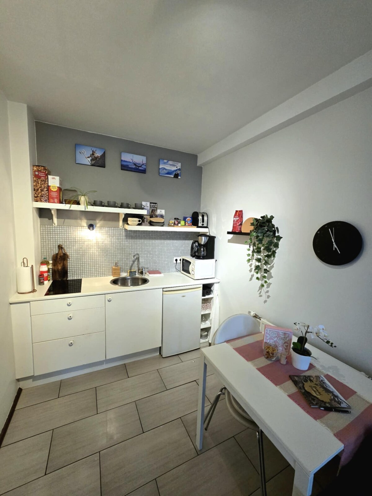 Pequeño apartamento. Un dormitorio doble en un garaje independiente reconvertido (junto a nuestra casa) con impresionantes vistas a la montaña y al mar y con una pequeña cocina. Todo es privado. Descripción: largo vestíbulo de entrada con espacio para colgar la ropa. En un extremo de la entrada se encuentra el dormitorio en sí, habitación espaciosa con cama tamaño queen, mesa y sillas y una pequeña pero bien equipada cocina. En el otro extremo hay un pequeño y acogedor baño con ducha. Aparcamiento privado. A pocos pasos del mar, piscina, museos y restaurantes.