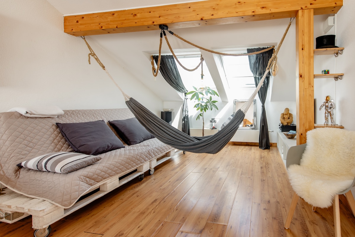 Siéntate y relájate en este tranquilo y elegante alojamiento bajo el techo. Recupera fuerzas y encuéntrate a ti mismo durante un tiempo de descanso. Disfruta de un paseo por el bosque adyacente o por el lago Müggelsee de Berlín, a solo 4 km de distancia. Distancias: 5 minutos a pie hasta el tranvía, 10 minutos hasta el S-Bahn Berlín-Friedrichshagen, 30 minutos en coche hasta Berlín-Mitte, 1 minuto hasta el bosque, 5 minutos hasta la panadería y la fábrica de helados orgánicos