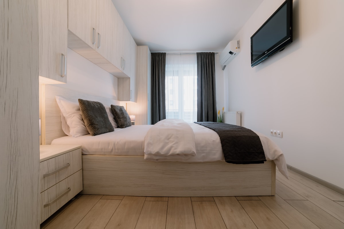 Ultramodern fully equipped apartment with private parking and smart lock for check in / check out. It is located in brand new residential area - Cartier Coresi, near the Coresi Shopping Resort, at 10 minutes from the historic center. It has a bedroom with queen size bed, living room with expandable sofa bed, fully equipped kitchen, air conditioning, large terrace with hammock, washing machine / dishwasher, two 4k TVs with Netflix and HBO Go.