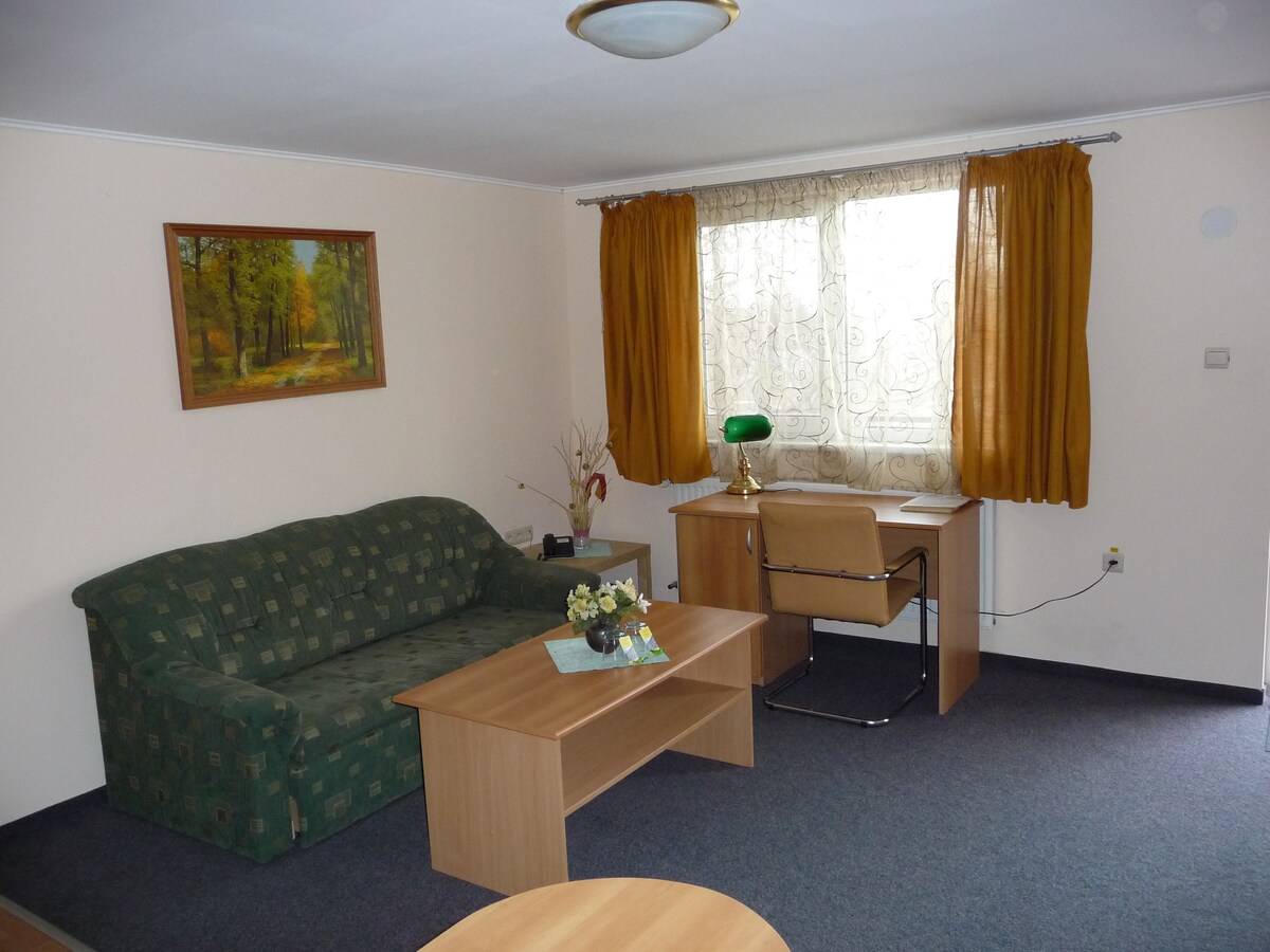 Departamento espacioso de 4 habitaciones (3 habitaciones separadas e intransitables) en las afueras de Bratislava en Stupava 10 min. bypass al centro histórico de BA A 3,5 km (5 min) de VW Eslovaquia. A 0,7 km (a 1 minuto) de la televisión Markíza. A 1,5 km de la autopista D2 ambiente agradable, hermosa naturaleza cerca, sitios históricos privacidad perfecta pago: efectivo, tarjeta, factura, cupón de alojamiento impuesto de residencia más bajo en y alrededor de BA: 0.50 € 1 pers. por noche sEÑAL WIFI de calidad GRATUITA 1 niño menor DE 5 años DE FORMA GRATUITA