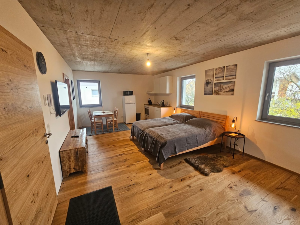 Apartamento moderno y limpio (30 m²) con baño privado, cocina totalmente equipada, cama doble o dos camas individuales. Incluye wifi, sábanas, toallas y artículos de tocador. ¡Check-in flexible las 24 horas! ¡Cuna de forma gratuita!