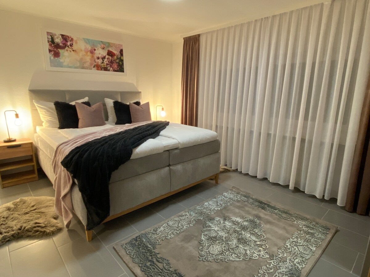 Die lichtdurchflutete Wohnung "Viktoria Lusie" umfasst das gesamte Erdgeschoss der STADT-LAND-SCHEUNE. Sie betreten die luxuriöse Wohnung vom mittelalterlich anmutenden Hof und blicken durch den Wohnraum sofort auf die große Terrasse mit Wasserspiel und Blick ins Grüne. Zwei Schlafzimmer links und rechts vom großen Wohn/Koch/Essbereich jeweils mit en suite Bad und japanischem Dusch-WC. Betten mit hochwertigen Tempur-Matratzen (je 160cm x 200cm ) für Schlafen wie auf Wolken und Entspannung pur.
