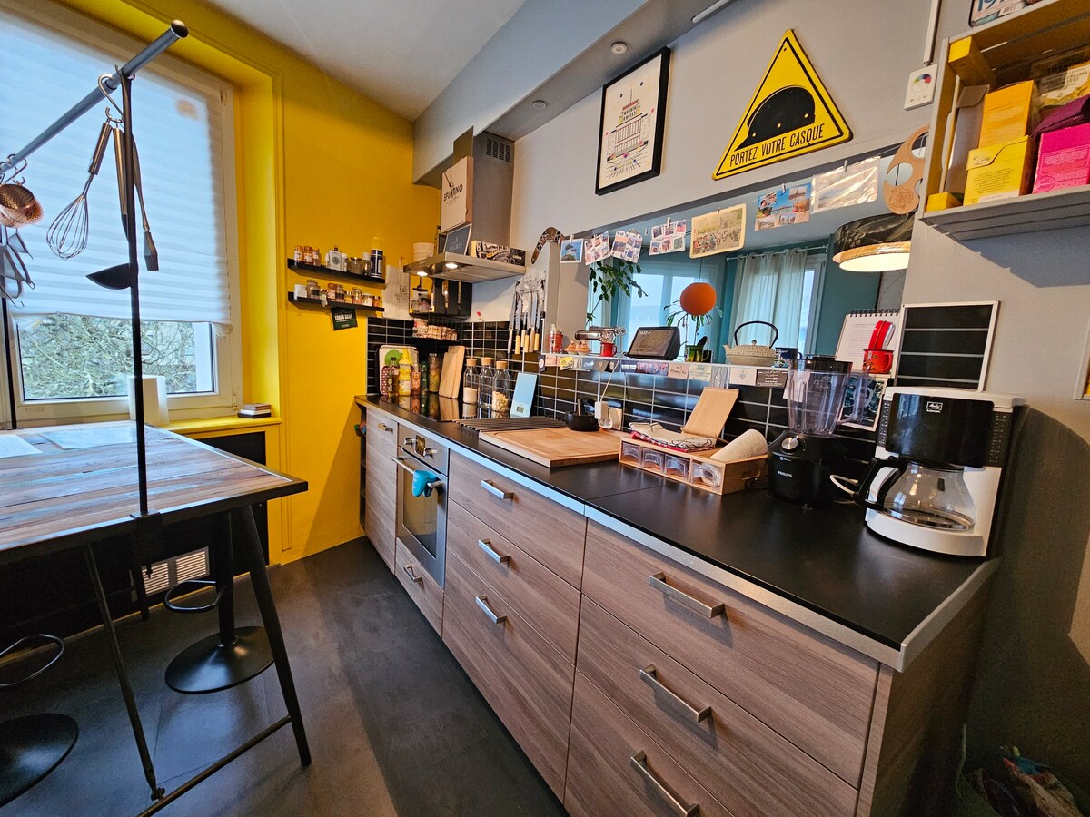 En el corazón del centro de la ciudad de Brest, bonito apartamento en la cuarta y última planta , sin vecinos. El apartamento es acogedor y consta de una hermosa sala de estar luminosa y soleada, así como de 2 dormitorios. Ideal para una estancia profesional o de vacaciones , el apartamento está bien equipado: Lavadora, internet, cafetera ( Nespresso) hervidor, horno, microondas , Tv....) Se proporciona la ropa de cama (sábanas y toallas). ¡Se sentirá como en casa!