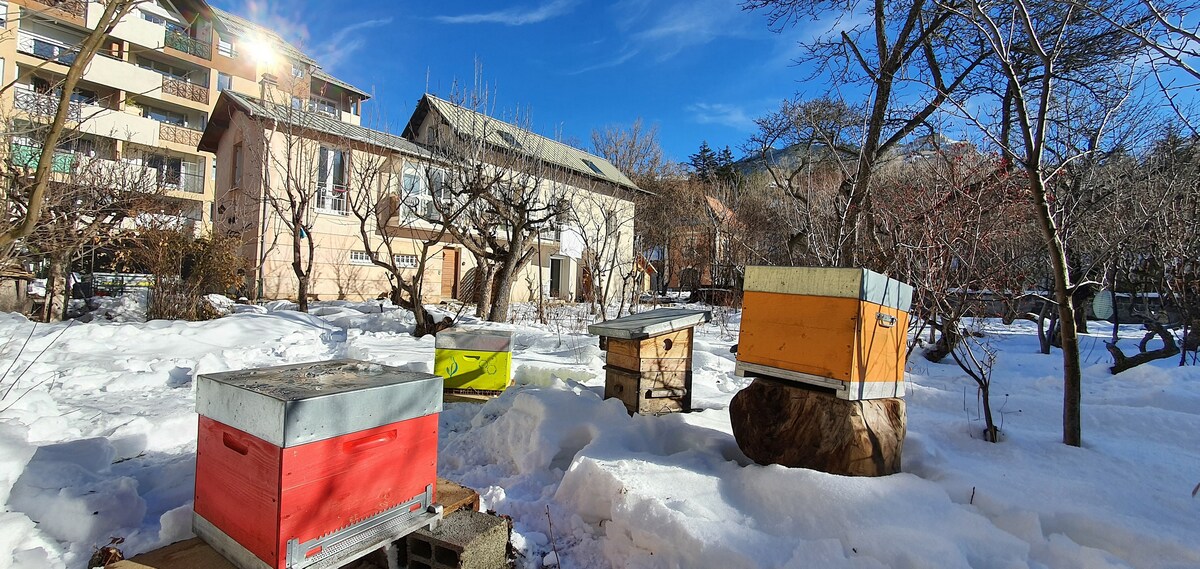 A 5 min des remontées mécaniques du Prorel à Briançon 🚗, tout en étant à l’abri du tumulte de la station. Magnifique studio entièrement pensé pour accueillir 5 personnes, avec parking gratuit,extérieur et local à skis. Cuisine équipée, canapé-lit,lits superposés, salle d’eau,WC séparés. Bus à 3 min vers le centre-ville, commerces à 2 min en voiture. Discrets mais disponibles si besoin, nous sommes très réactifs. Linge de lit et serviettes de toilette fournis.