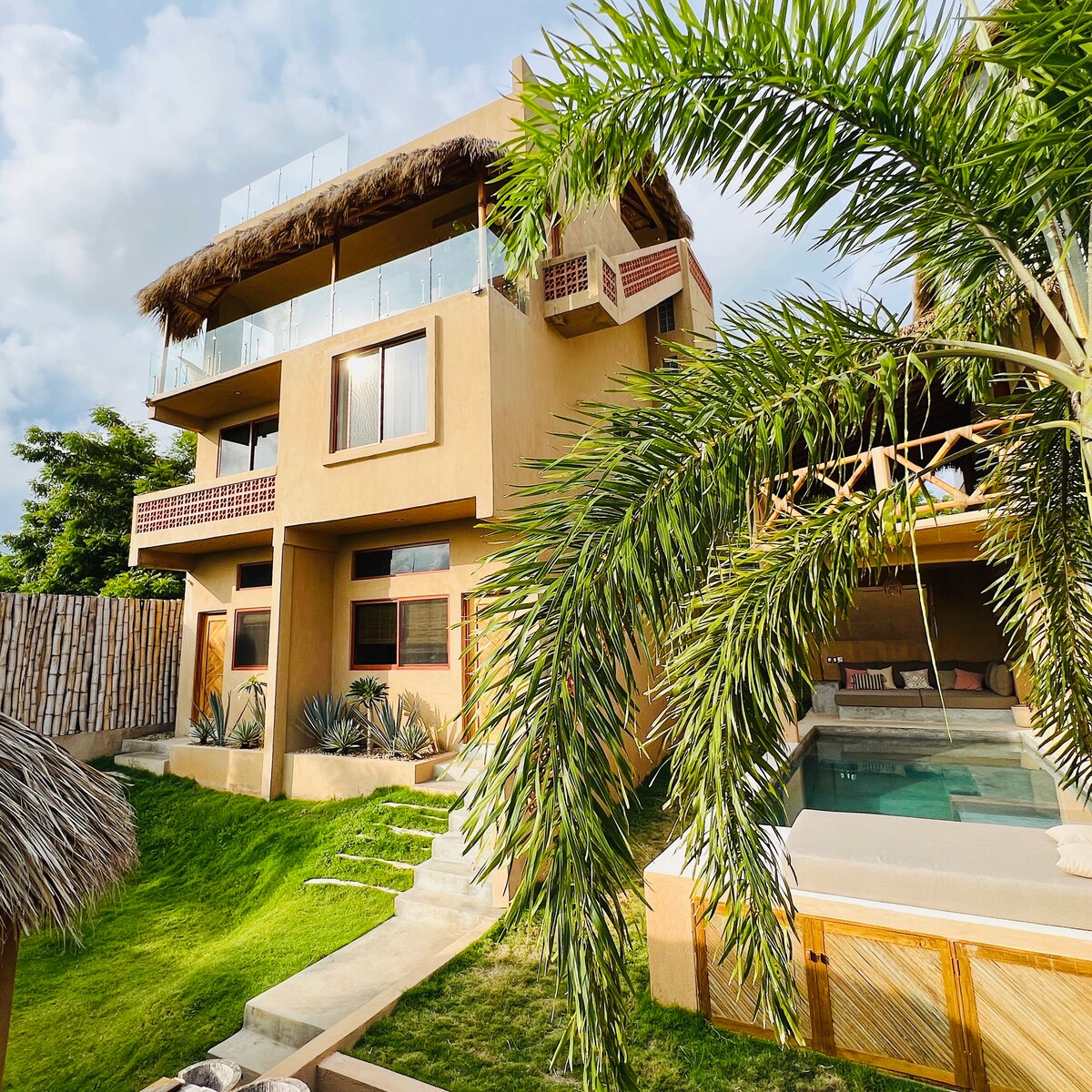 Despertar frente al mar, sentir la brisa y escuchar las olas marca el ritmo de la estancia. La pérgola abraza una palmera viva y desde ella un columpio desciende hacia la alberca, invitando a pausar el tiempo. Es un espacio para respirar, leer, crear o simplemente estar, rodeado de naturaleza y calma. Cada momento se vive lento y auténtico, profundamente conectado con el océano, su energía y la sensación de libertad que hace difícil querer irse.