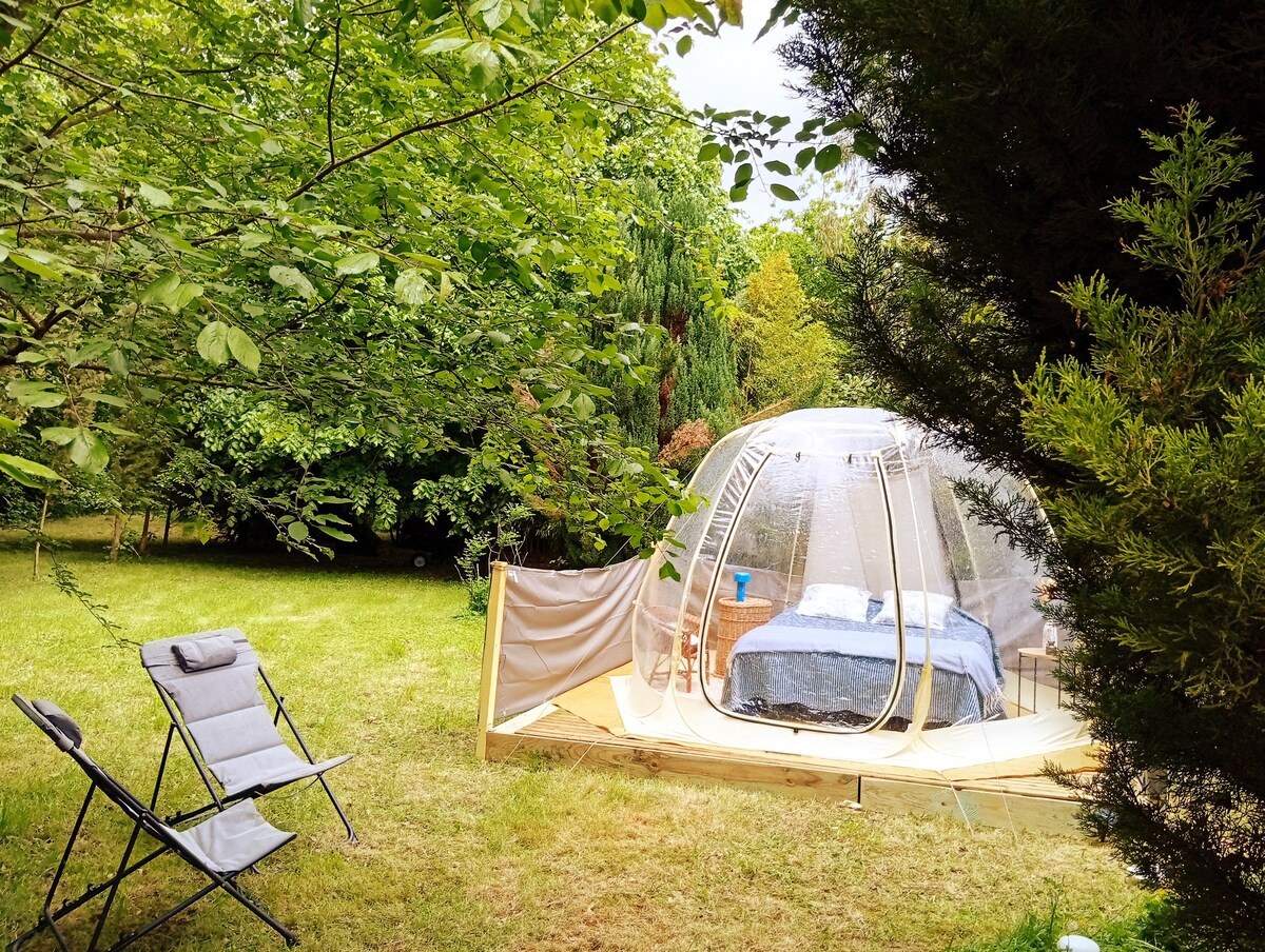 En un entorno verde, vuelve a conectar con lo esencial en una burbuja transparente. ¡Acuéstese para admirar el cielo azul o contemplar las estrellas al caer la noche!Hay libros a su disposición para iniciarse en la astronomía... ¡sumérjase en el mundo de las constelaciones!Te doy la bienvenida a mi jardín bucólico para vivir una experiencia lo más cerca posible de la naturaleza. Déjate cautivar por el canto de los pájaros. (Encuéntrame en Instagram: vous_etes_au_bon_endroit)