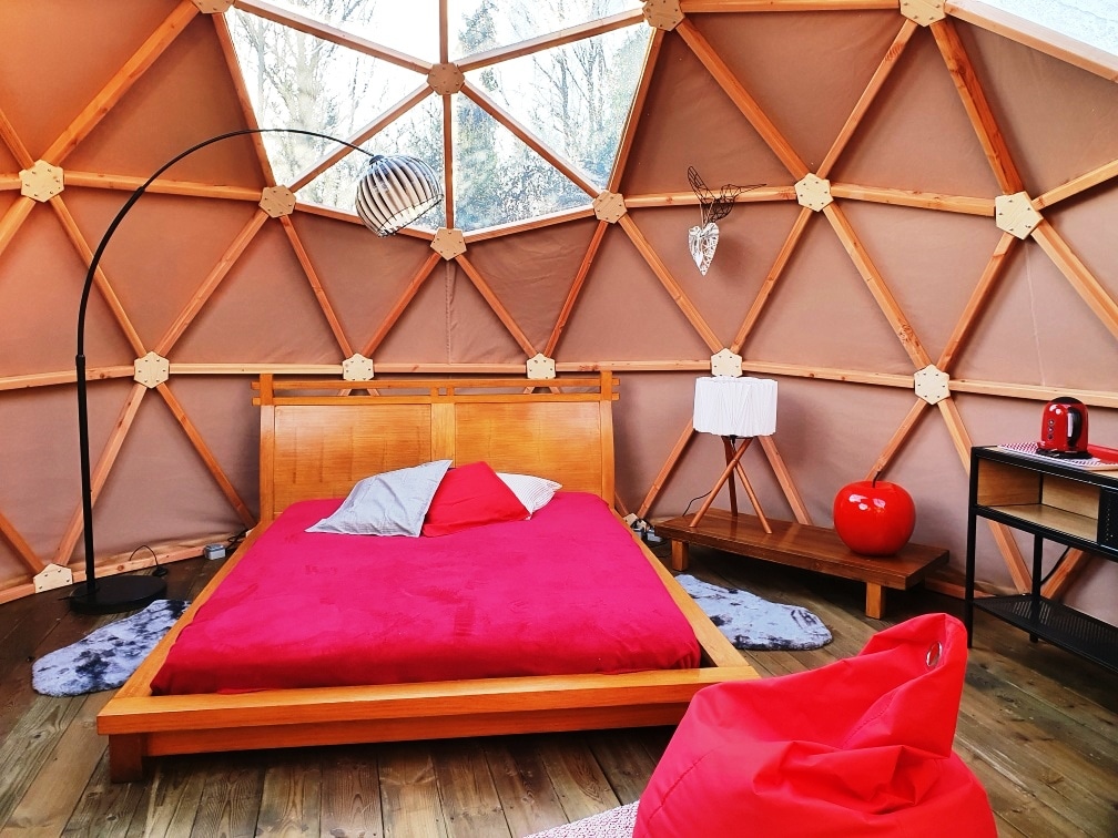 Venga a descubrir los placeres de una noche de relax bajo las estrellas. Nuestro dodôme se encuentra en el corazón de la naturaleza para el placer de los ojos y los oídos. Este hábitat, todo redondeado, tiene capacidad para 2 personas en una cama cómoda. Dispone de una terraza orientada al sur para disfrutar de su desayuno incluido. Para relajarse, puede reservar una cita en el SPA(con suplemento) o ir al complejo acuático que se encuentra a 100 metros. el acceso a la piscina está incluido en la tarifa