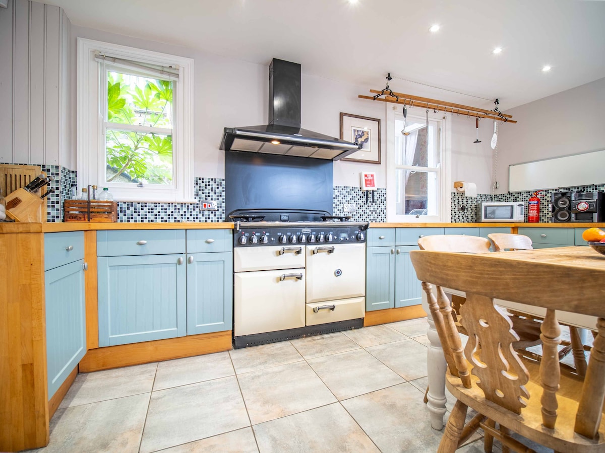 Ubicada en el histórico casco antiguo de Margate, esta propiedad de grado II se encuentra a pocos minutos de la playa, Turner Gallery, Dreamland, tiendas vintage y restaurantes galardonados. La casa cuenta con una cocina bien equipada, una acogedora sala de estar con chimenea y sofá cama, y un rincón acogedor con asientos y servicios de streaming. La planta superior ofrece un dormitorio principal con una cama tamaño queen y TV, una habitación más pequeña con dos camas individuales y un patio privado con una barbacoa para comer al aire libre.