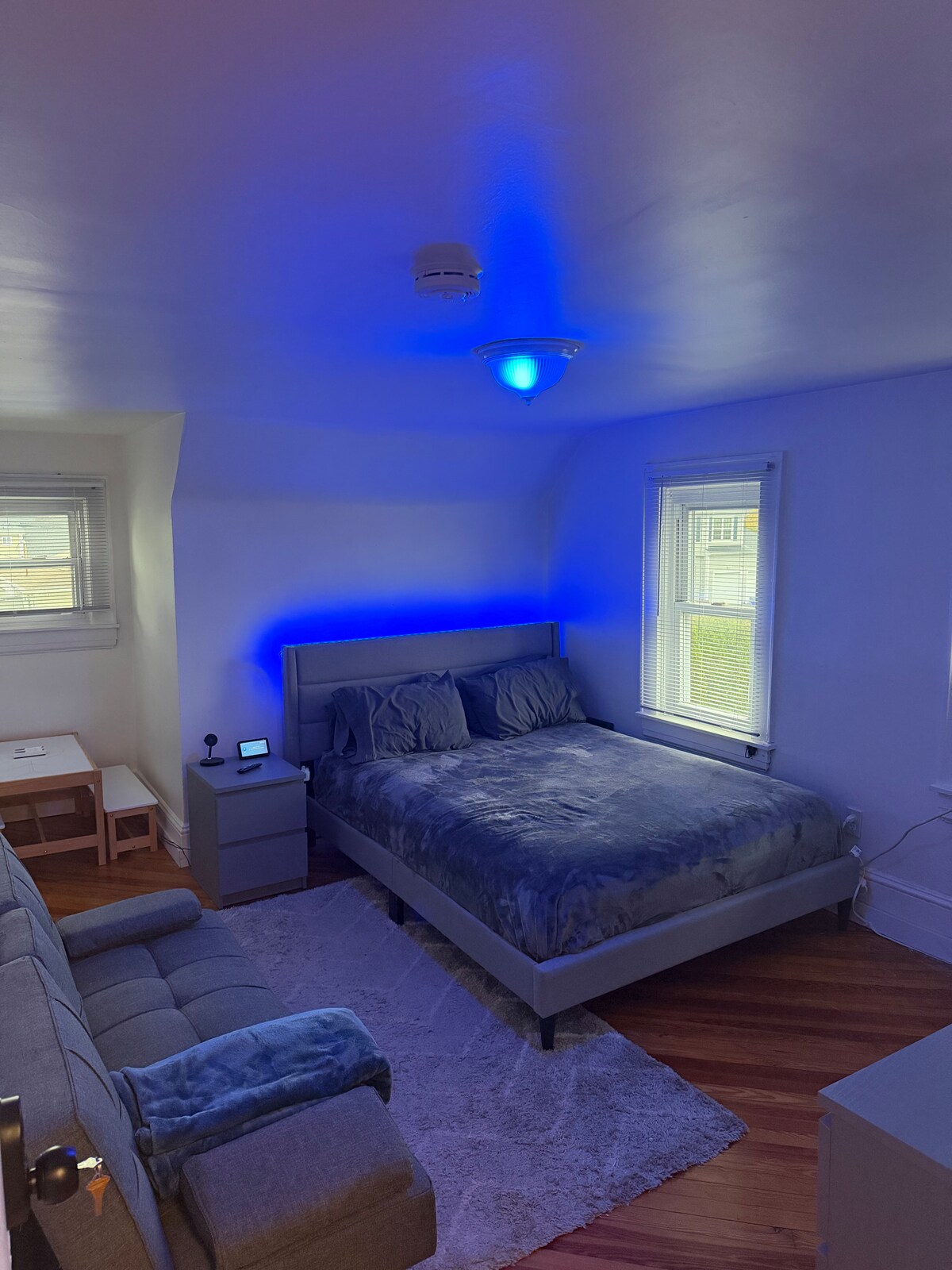 Cozy Modern Getaway in Centereach! Perfect for students, medical visitors, and travelers. Relax in a bright living area with 55” Smart TV+PS5, dine at a 2-seat nook, and cook in the well-equipped kitchen with refrigerator, microwave, coffee maker, popcorn machine, cookware, dishes, glassware and more. Bedroom with fresh linens, (queen size bed), clean bathroom, fast Wi-Fi 300 , AC/heat, and free parking. Close to Stony Brook Univ 13 min, Port Jefferson Hospital 15 min, and Suffolk College 5 min
