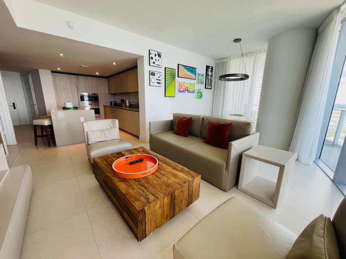 Hermoso apartamento en el piso 33, con increíbles vistas al mar y a la costa!! El apartamento tiene 1 suite, 1 cama king size y sofá cama, totalmente decorado. Tenemos Internet, lavadora y secadora, cafetera, microondas, refrigerador SubZero, lavavajillas, estufa, etc. Descansa en confort, disfruta de 2 excelentes restaurantes, 2 piscinas infinitas, gimnasio totalmente equipado con una hermosa vista al mar En la playa, tenemos sillas de playa, toallas y paraguas. Lugar perfecto para relajarse con la familia o los amigos.