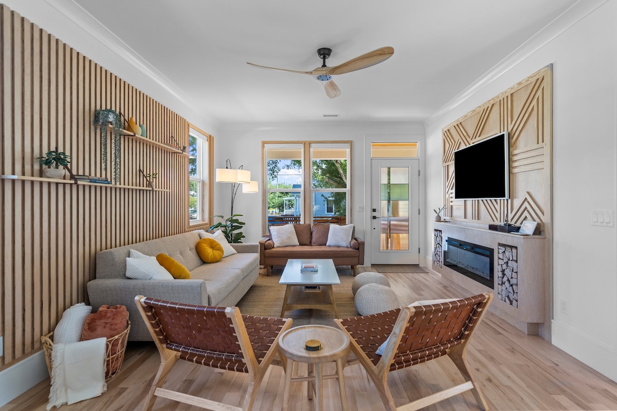 Exquisitamente diseñado 3 dormitorios + oficina / 2 baños completos. ¡Nueva construcción, ideal para familias! Sala de estar llena de luz con chimenea eléctrica, cocina y gran comedor. Suite privada con cama tamaño king y amplio baño con ducha de efecto lluvia. Al final del pasillo hay un segundo dormitorio con cama tamaño queen y un tercer dormitorio con dos camas individuales, que comparten un baño completo con bañera. Espacio de oficina, 2 porches cubiertos, lavandería, aparcamiento fuera de la calle, persianas opacas, cuna/silla alta y sofás cama. ¡A pocos pasos de restaurantes y tiendas y a 20 minutos en coche de la playa!
