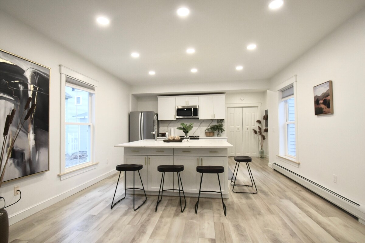 Aspectos destacados de esta propiedad * Totalmente renovado: todas las superficies, electrodomésticos y muebles son nuevos en 2020 * A 2 minutos a pie de Bowdoin College, restaurantes, cafeterías y tiendas de comestibles. * Aparcamiento fuera de la calle. * Lavadora y secadora * Concepto de vida abierto de un solo piso * Baño grande con tocador doble * Gran isla de cocina para reunirse y entretenerse * 2 camas tamaño king y 1 cama individual para dormir cómodamente * Aislamiento superior para mantenerte caliente en invierno y fresco en verano. MUY importante para Maine.