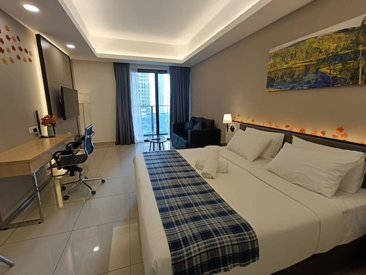 This HomeStudio is located at Tower 4, Grand Ion Delemen, Jalan Ion Delemen, 69000 Genting Highlands, Pahang, Malaysia. It is at the peak of Genting Highlands and situated 6,000 feet above sea level. Guests could enjoy the invigorating cold breeze and pleasant 17°C weather, featuring coxy and autumnal sensation with flying maple leaves and earthy hues. The unit is designed for families and friends, providing comfortable stay amidst breathtaking surroundings.