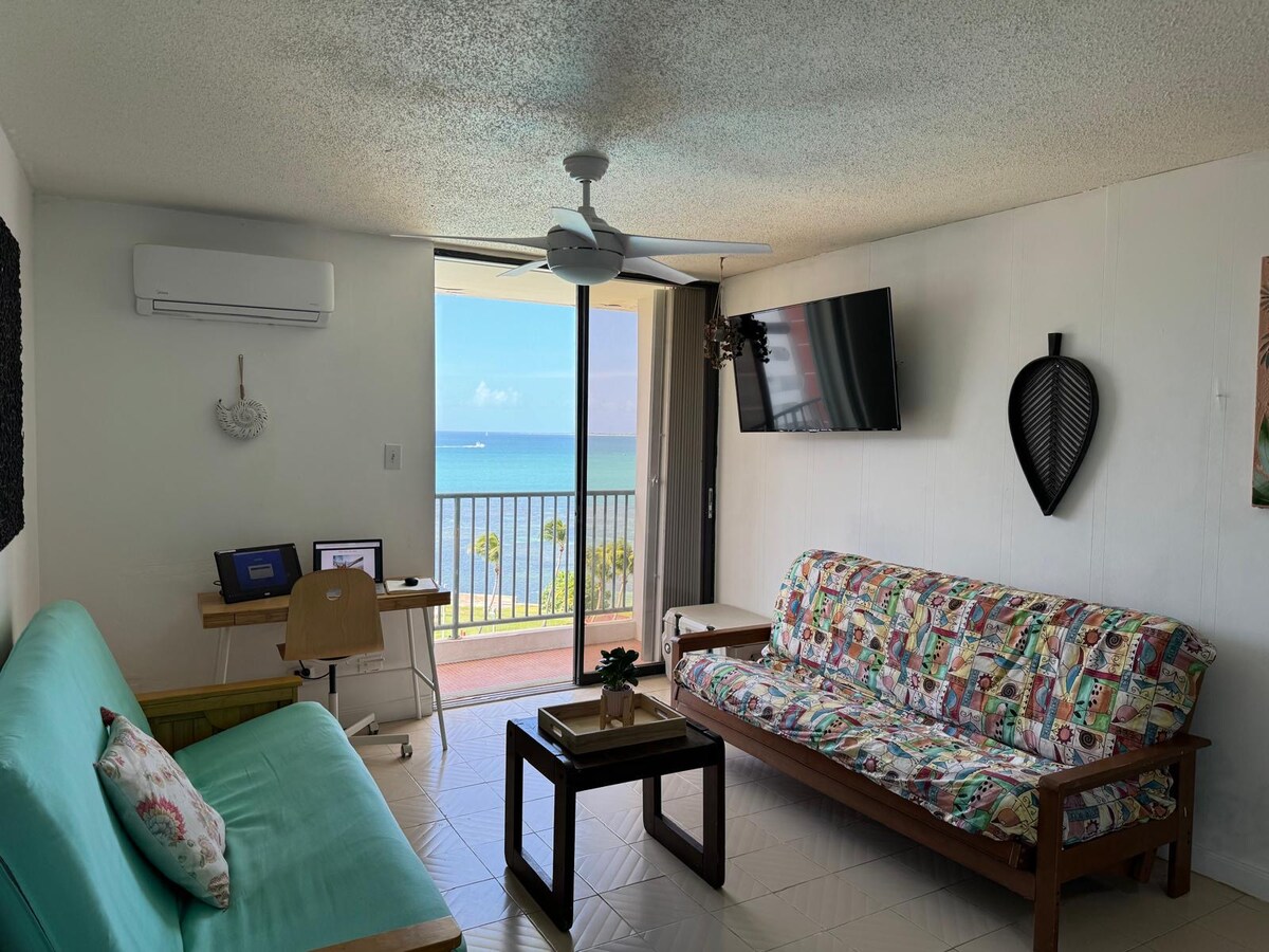 Welcome to the best view!, a Caribbean oceanfront oasis with breathtaking views from the balcony and bedroom. Relax with coffee or wine as you enjoy stunning sunrises and sunsets. The apartment offers a queen bedroom, full kitchen, cozy living area, and a hammock on the balcony. Guests enjoy amenities like an Olympic pool, sports courts, BBQ gazebos, and 24/7 security. Located near Villa Marina, it’s perfect for island excursions and water activities. Private services are available on request.
