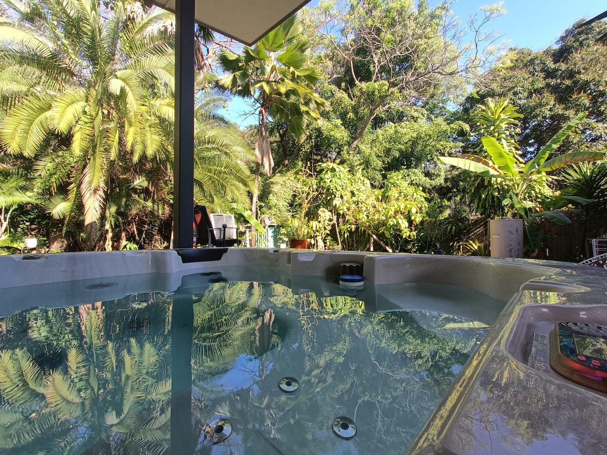 15 mins drive from town. Gorgeous Haven -rainforest surrounds - like living in your own resort! Private Entrance,Self Contained,Kitchen,lge bedroom, gorgeous ensuite,large courtyard, table chairs, Aircon. Microwave cutlery crockery tea coffee milk, toaster, portable cooktop, Airfryer BBQ. NETFLIX. Own Ensuite bathroom. Rest of place is shared- ie laundry, pool, backyard- use at your leisure. Lil & Rob live here +Ziggi our small non-malting clean humanoid pooch! Tap water great 4 drinking