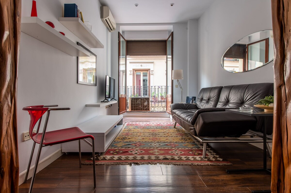 ALQUILER DE CORTA ESTANCIA Magnífico apartamento de 45 metros cuadrados en todo el centro de Madrid. Con un diseño y decoración espectacular, espacios amplios y techos altos, el apartamento está equipado con todo lo que necesitas para tu estancia en Madrid. El salón tiene tres balcones a la calle que aportan una gran luminosidad al piso. El dormitorio tiene el baño en-suite y un escritorio de trabajo. Desde el apartamento podrás visitar andando casi todos los puntos emblemáticos de Madrid.