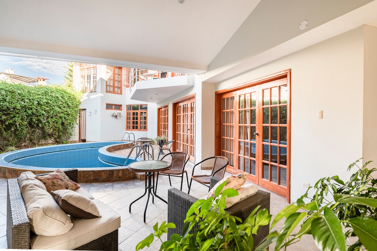 Private oasis in the historic district of Baños Del Inca. Pool water is directly from the natural hot springs. This is a three bedroom, 2.5 bath home with private pool, full kitchen, living room and dining room. 10 minutes away from the town of Cajamarca. This home is located in the exclusive residential community of Laguna Seca. Travelers visit the public Inca baths located two blocks away. Located one block away is the Baños Del Inca Mercado, where you can food shop all local produce.