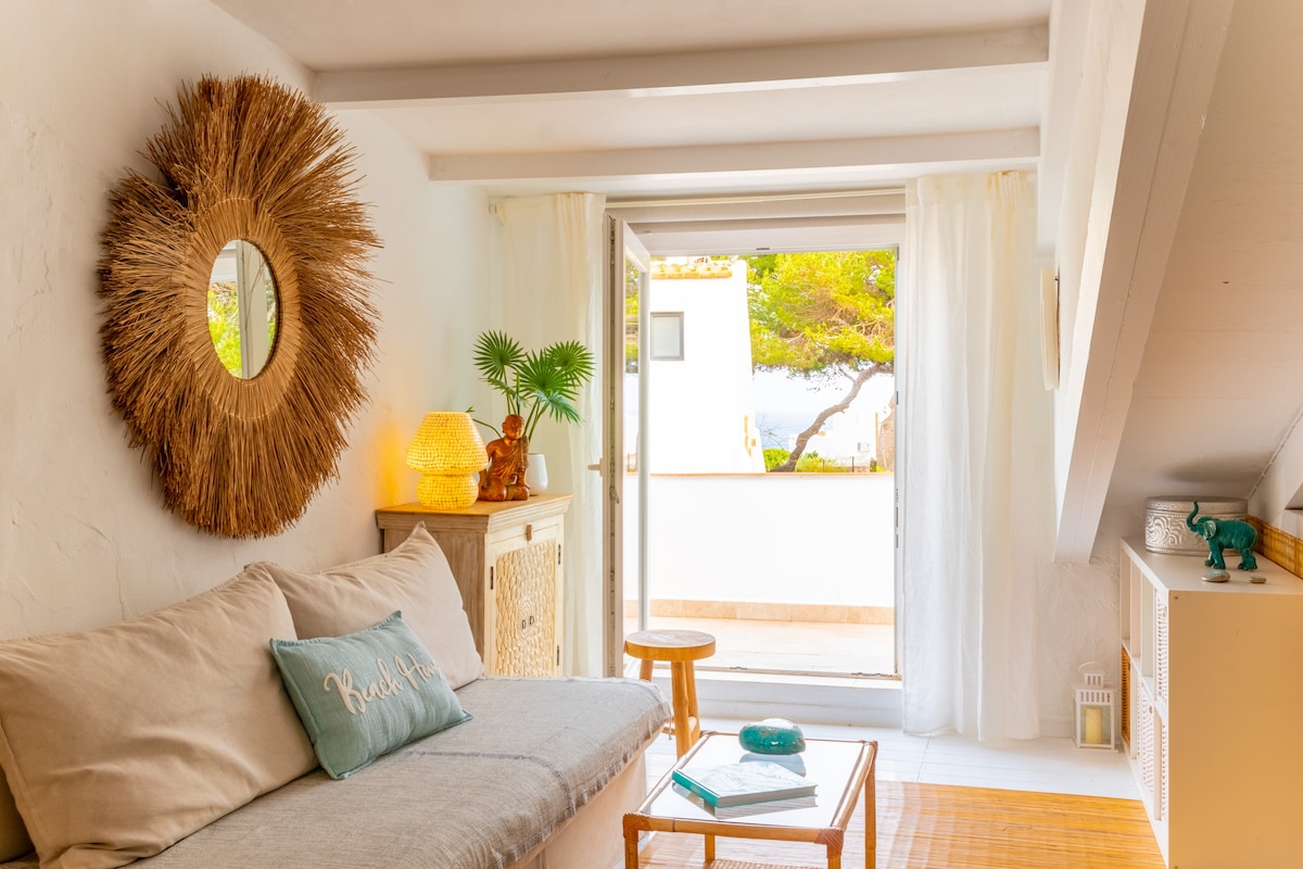 Cala Serena, zona de Cala d'Or Sureste de la isla, alojamiento en un remanso de paz entre tierra, cielo y mar a 50 minutos del aeropuerto de Palma. Encantadora casa de estilo típico ibicenco con vistas al mar a 5 minutos andando de la playa, en urbanización privada sobre un acantilado al borde del agua. La casa consta de salón, pequeña cocina, 2 dormitorios y 2 baños. El dormitorio de la planta superior está en un entrepiso y cuenta con una zona de relax. Hay 3 terrazas y aparcamiento gratuito.
