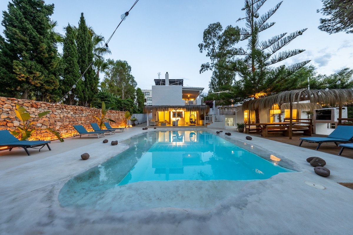 Encantadora villa de estilo boutique enclavada en un romántico jardín verde con árboles viejos y flores. Con sus terrazas, zonas de relax y una pequeña piscina privada encantadora, la propiedad ofrece un gran espacio y privacidad para 8 a 9 huéspedes. Los 4 dormitorios tienen aire acondicionado. Internet: ¡fibra óptica de alta velocidad! A 6 minutos a pie se llega a la hermosa playa de arena de Cala Llonga. Restaurantes, supermercados, tiendas y parada de taxis a solo 4 minutos a pie. A Ibiza Golf o Santa Eularia se tarda 5 minutos en coche; a la ciudad de Ibiza se tarda 12 minutos.