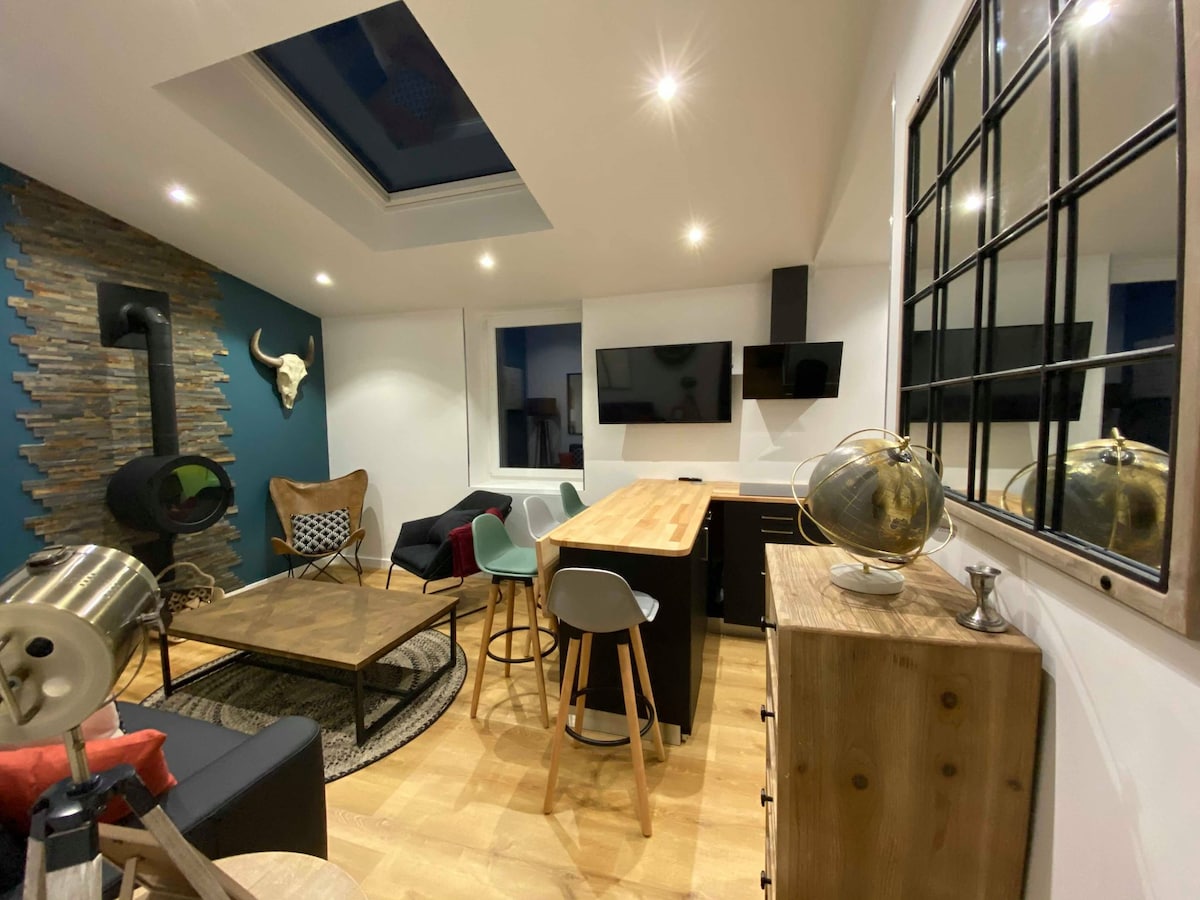 Una suite de 30 m2, dedicada a la relajación. Nuestra casa de campo consta de una entrada que da acceso a los aseos Una zona de cocina equipada (nevera, placa de inducción portátil, cafetera, hervidor, tostadora, microondas, vajilla) Una cama «queen size» de 160 cm × 200 cm Una pantalla plana de 138 cm conectada Una chimenea eléctrica con llamas, una acogedora sala de estar Un cuarto de baño vegetal con su lavabo de piedra y su gran ducha tropical con luminoterapia, un balneario de 2 plazas, con radio y bluetooth integrado.