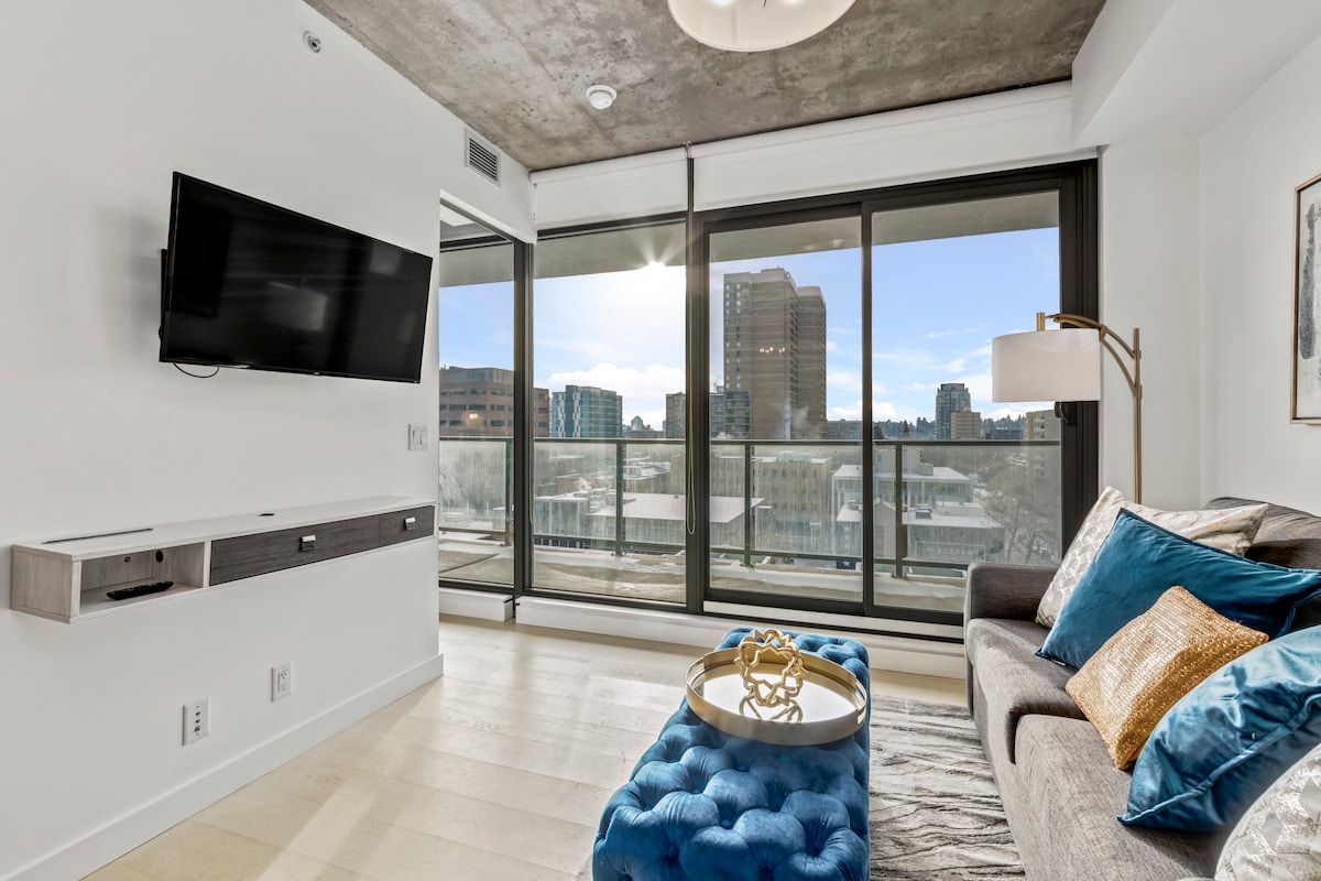 ¡Te damos la bienvenida a nuestro apartamento estudio recién construido en el edificio Nude en el centro de Calgary! Cuenta con amplias ventanas del suelo al techo que invitan a disfrutar de abundante luz natural, una acogedora cama tamaño queen, un lujoso sofá y una cocina totalmente equipada. Aventúrate a la animada 17th Avenue, a pocos minutos de tu puerta, repleta de boutiques de moda y opciones gastronómicas. Ya sea que estés aquí por negocios o por placer, nuestro estudio ofrece comodidad en el centro de la ciudad, acompañado de una cautivadora vista del horizonte de la ciudad.