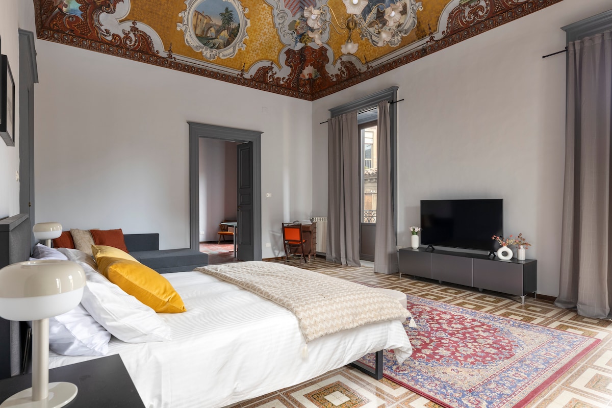 Sumérgete en la historia y el estilo en el corazón de Catania. Este elegante apartamento se encuentra dentro de un palacio del siglo XIX adornado con techos con frescos originales, una rara oportunidad de alojarse en un lugar verdaderamente auténtico. Los altos techos abovedados y los seis balcones con vistas al centro histórico aportan luz natural y una sensación de espacio. A solo 5 minutos a pie de Piazza Duomo, el famoso mercado de pescado y el Teatro Bellini, estás en una ubicación perfecta para experimentar la auténtica Catania. Estacionamiento privado disponible