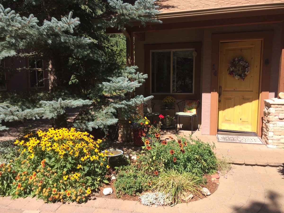 Perfect location in Sun Valley both summer and winter. Home of the World Cup! Just 3min walk to Warm Springs lodge and lifts. Ski, hike, mtn bike, fly-fish out your front door. Relax on your back deck, couch, cozy elevated bed with fluffy comforter, art, books, smart tv, yoga mat; Enjoy a fully stocked cozy studio condo with wifi, tv, full kitchen, washer/dryer, ski locker. Condo is on bus route to town, River Run, and airport so car optional, and free parking right outside condo.