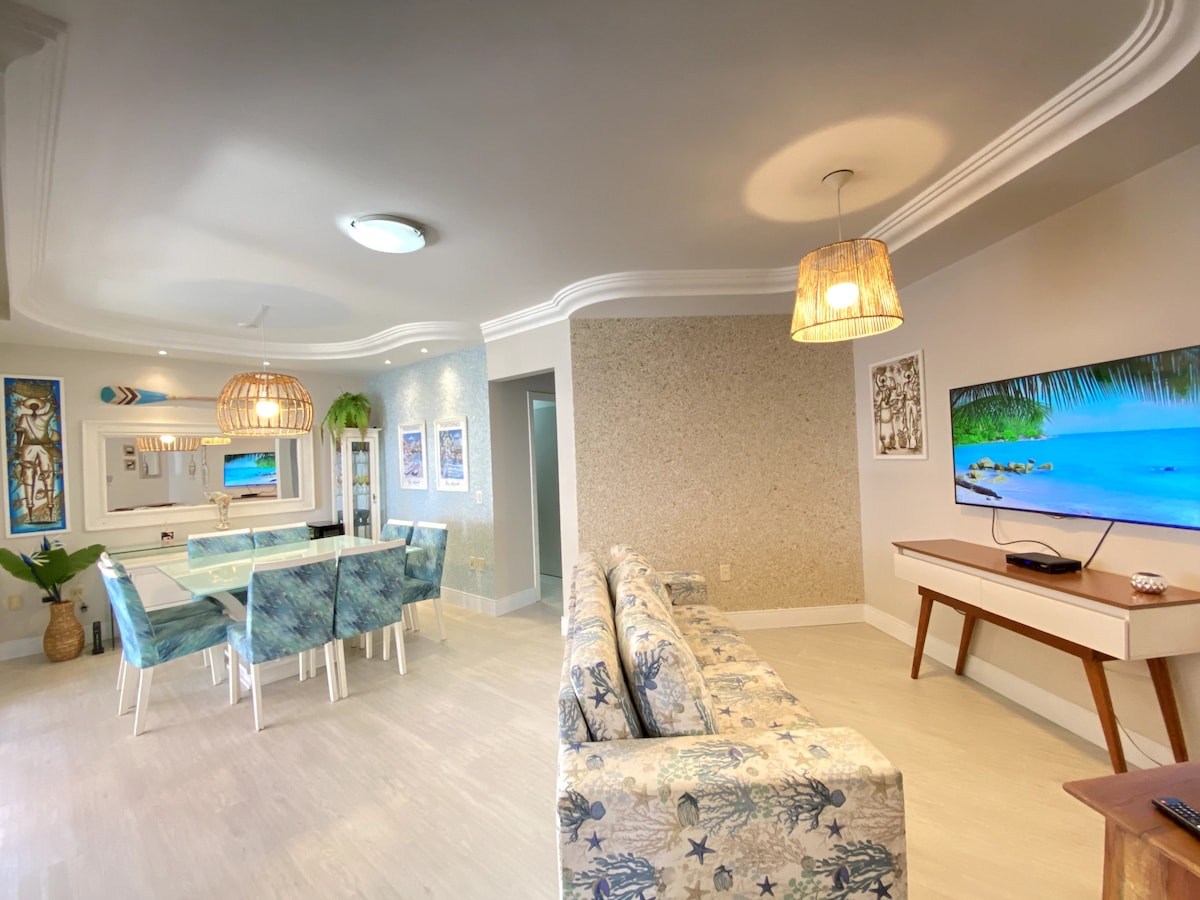 ¡Apartamento a 80 metros de la playa! Cerca de Atlantic Shop 1 suite queen + 2 dormitorios dobles (todos con aire acondicionado y ventilación en el techo) + 1 colchón individual adicional 2 bañeras con ducha de gas Cocina equipada con utensilios, nevera, microondas, freidora de aire, horno, licuadora, purificador de agua helada, hervidor de agua y cafetera eléctrica, integrada con la sala de estar, cafetera, televisión inteligente, televisión por cable y sofá cama. Espacio privado para un auto grande Se proporcionan ropa de cama, mesa y baño. Límite para 6 personas.