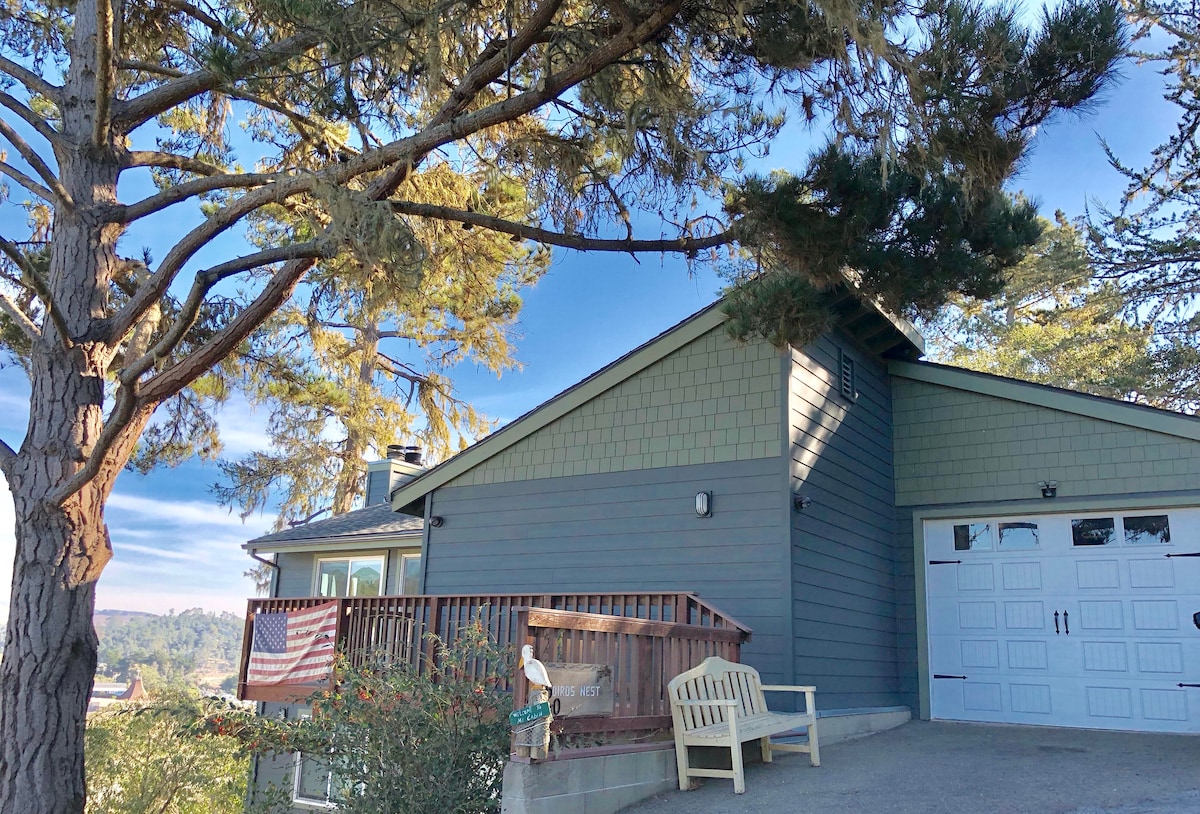 Perched on a tree filled hillside overlooking both Highway One & Santa Rosa creek and backing to the protected Fiscalini Ranch, this home is walking distance to the hiking trails w/ ocean views, the beach and a neighborhood park with beach access. -Full kitchen+ BBQ -Wifi -Netflix -TV in every room Enjoy all that Cambria has to offer from this cozy home near Fiscalini Ranch. *BEFORE BOOKING-Please see "Other Things to Note" section to review additional details /reservation information*