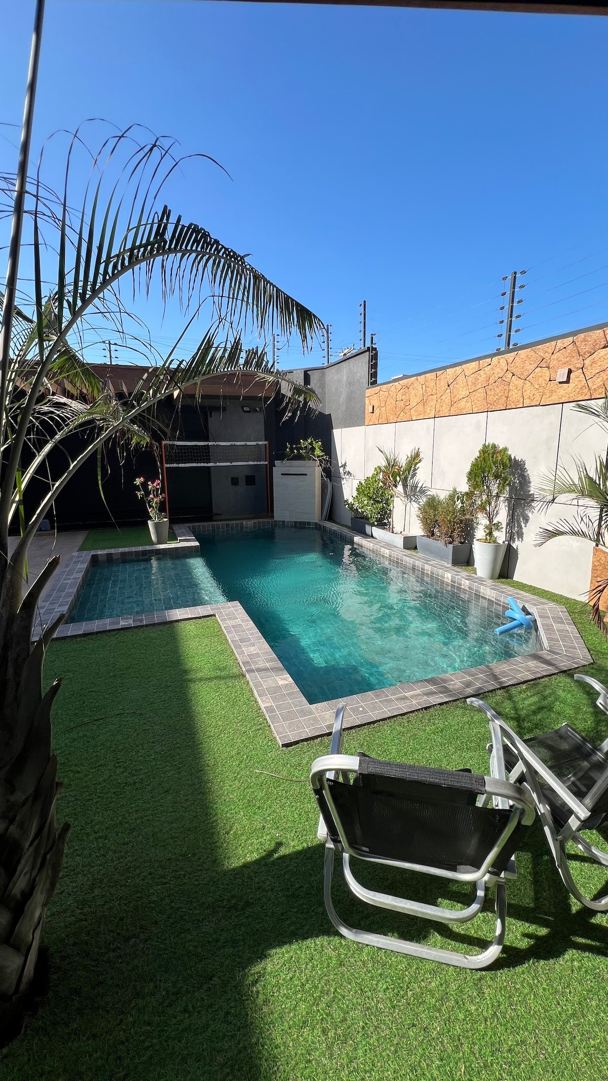 Casa ampla, com jardim. Quatro quartos (três suítes), além de uma dependência. As três suítes e o dormitório/escritório no térreo têm aparelhos de ar-condicionado. Cozinha completa e equipada com geladeira, micro-ondas, airfryer, liquidificador e utensílios. Sala de estar ampla e sala de jantar. Deck com pia e fogão, além de mesas e cadeiras. Estacionamento coberto no deck para dois carros, além de espaço não coberto para vários veículos. Casa ideal para estadia de família.
