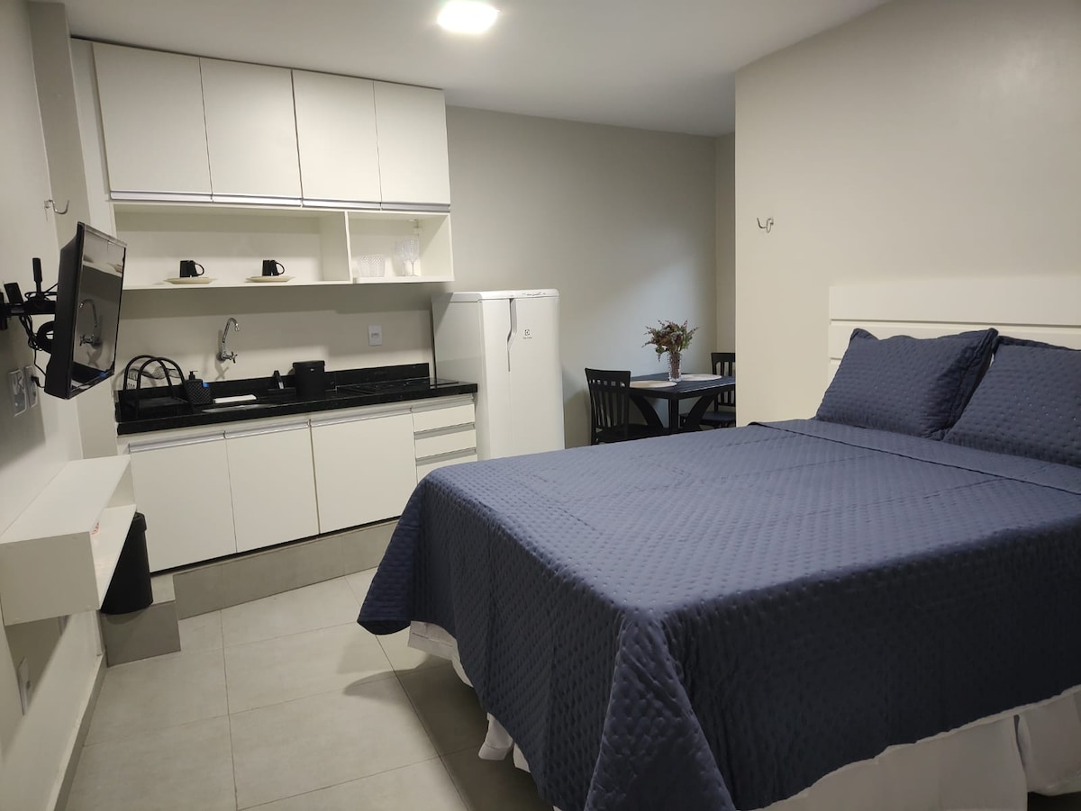 Definitivamente en la puerta del parque del pueblo, como podemos ver en las fotos tiene el mapa, está cerca de todo, comercio, integración, plazas, tiendas, supermercados, puntos turísticos, bares y restaurantes, base de la PM, Clínicas y Hospital. Todo limpio y nuevo, Internet wi-fi rápido, TV-32 (smart-tv), utensilios básicos de cocina, cama y juego de cama completo. Tiene capacidad para 2 personas, apartamento limpio, en el edificio silencio y la organización es fundamental, vecinos estupendos, coanfitriones estupendos. ¡Te esperamos, gracias!