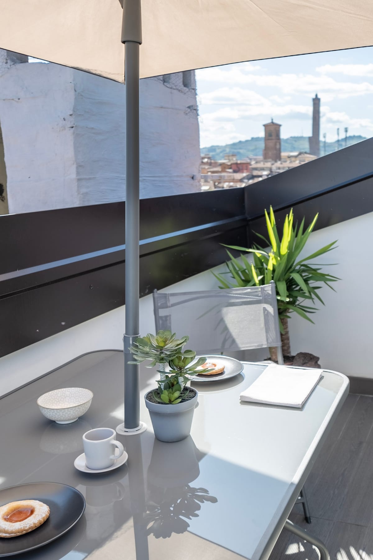 Altana con techos inclinados, vista privilegiada a las Dos Torres y con terraza interior con vista panorámica a las torres y azoteas de Bolonia, prestigioso y único. Totalmente equipado y finamente amueblado, con wifi ilimitado, TV HD de 50 pulgadas, Netflix, aire acondicionado y capacidad para un máximo de 4 huéspedes. El apartamento está situado en un elegante edificio recientemente renovado en el centro histórico, a una distancia estratégica a pie de las principales atracciones de la ciudad.
