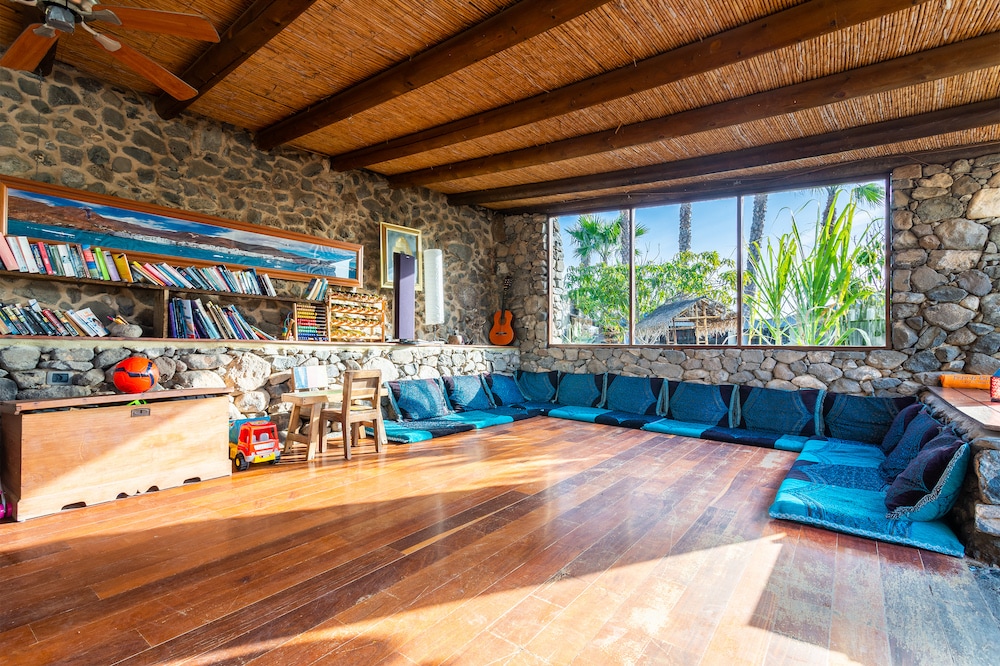 Experience glamping in style! Luxurious 8 metre Super Yurt, at beach location, with 2 curtained sleeping areas, ideal for a family/couple looking for extra space. Perfect fully equipped holiday home with stunning sea views, large terrace and garden. Perfect for a family holiday. Off-grid Finca de Arrieta facilities include a solar-heated pool, eggs from the hen house, free wifi, playground, honesty shop. Just 300mt walk to beach & restaurant.