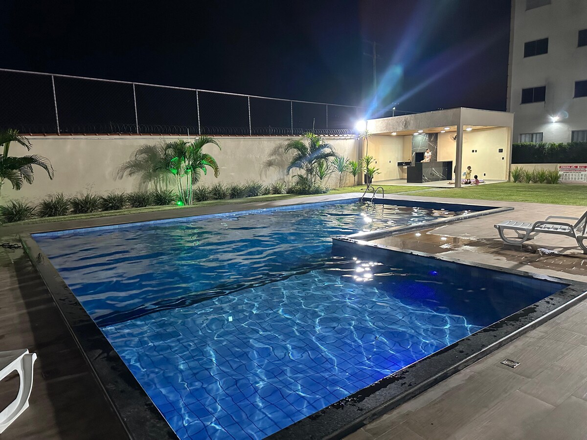 El apartamento tiene 2 dormitorios con camas dobles, una hamaca, aire acondicionado, wifi, una sala de estar con TV, una cocina equipada y un baño con ducha de agua caliente. El condominio está cerrado, seguro, con conserje las 24 horas y área de ocio con piscina para adultos y niños. ¡Ideal para familias, parejas o aquellos que están en el trabajo!
