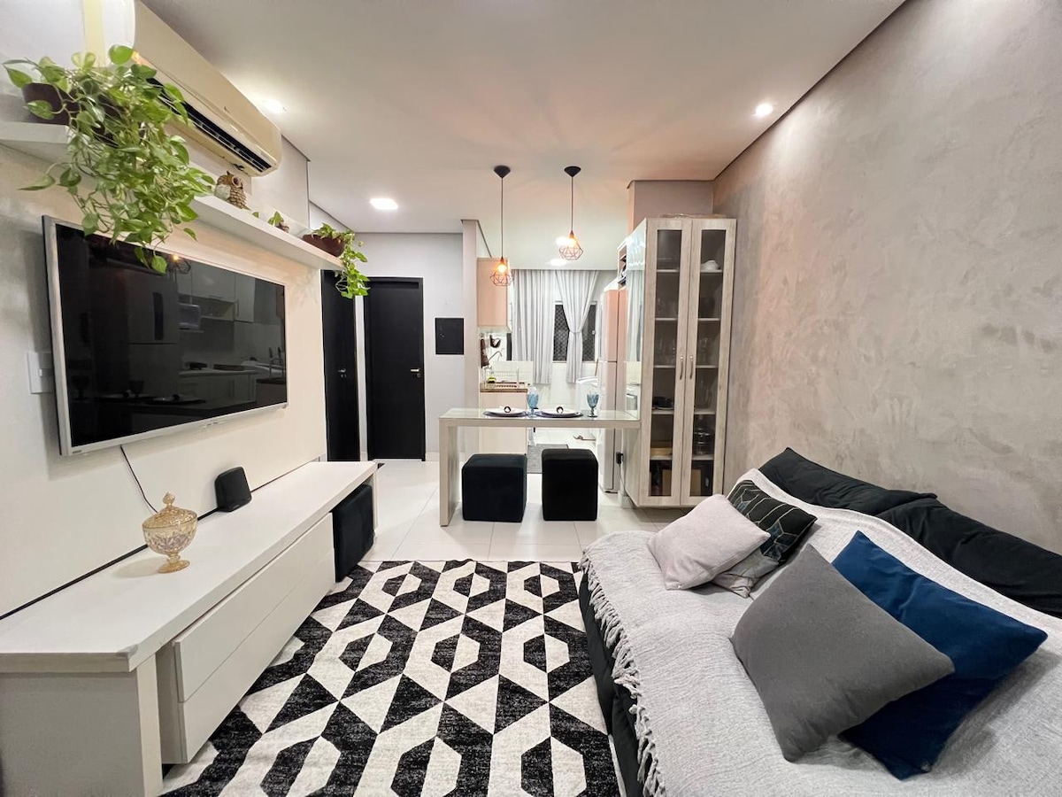 Apartamento con cocina completa, TV inteligente de 55", AIRE ACONDICIONADO CENTRAL, cama tamaño queen, baño accesible, ¡estacionamiento solo para MOTOCICLETAS! En una aldea de apartamentos de Airbnb, y en una ubicación perfecta, una calle detrás de Jatuarana, junto a dos grandes supermercados, fácil acceso a la aplicación Uber, vecindario tranquilo. ¡ESTACIONAMIENTO SOLO PARA MOTOCICLETAS! Los pacientes que reciben tratamiento oncológico tienen un descuento en su estancia, hablan con la anfitriona para obtener más información.