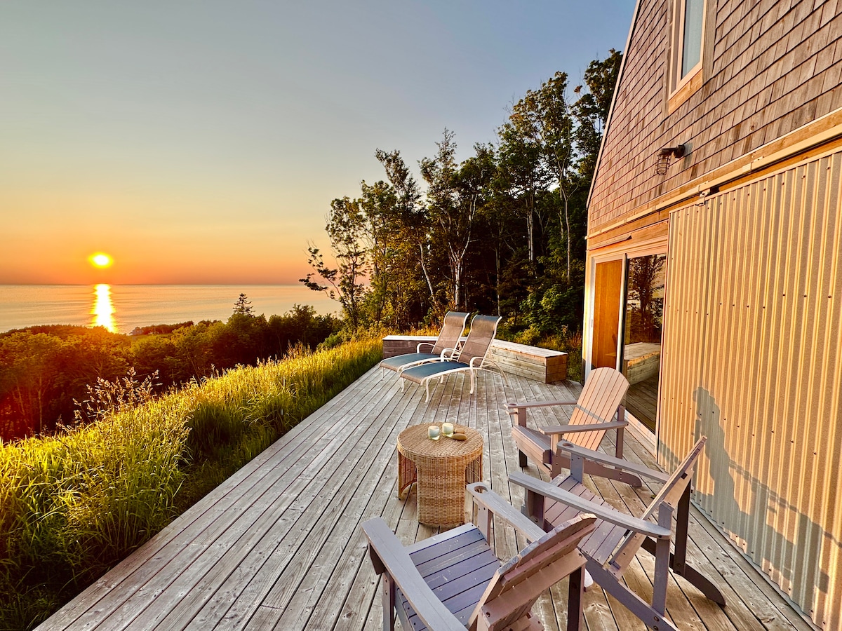 Cliff Waters Cottage is set on a private 89-acre oceanfront property with panoramic views of the ocean, sunsets, mountains and coastline. Whales and eagles are regularly spotted from the deck of this thoughtfully designed open concept cottage. The breathtaking property, with secluded beach access, is located just minutes from the Cape Breton Highlands National Park, making Cliff Waters Cottage the premier destination for couples who love privacy, and the beauty of Cape Breton Island’s coast.