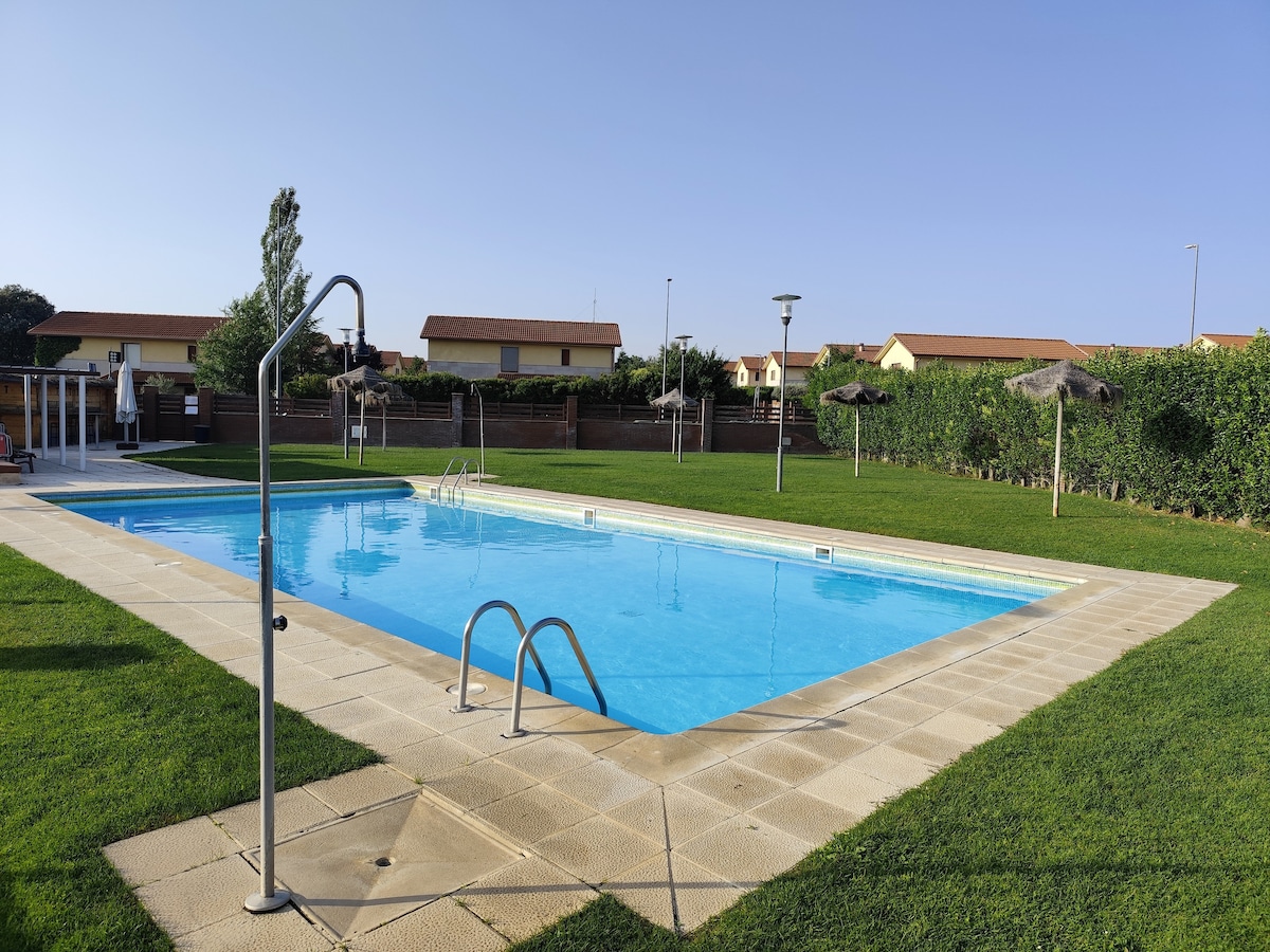 Casa independiente ideal para parejas y pequeñas familias. Aparcamiento y jardín privado, no compartido, porche y barbacoa No es una habitación, es un precioso cottage. Salón de concepto abierto. Zona de estar orientada a la chimenea de leña y smart TV, comedor con cocina integrada, baño completo, doble lavabo y precioso dormitorio con cama XXL. Próxima a la salida 375 de la A66. Descanso ideal entre el norte y sur Consulta si vienes con mascota. La piscina a 100 metros y es comunitaria