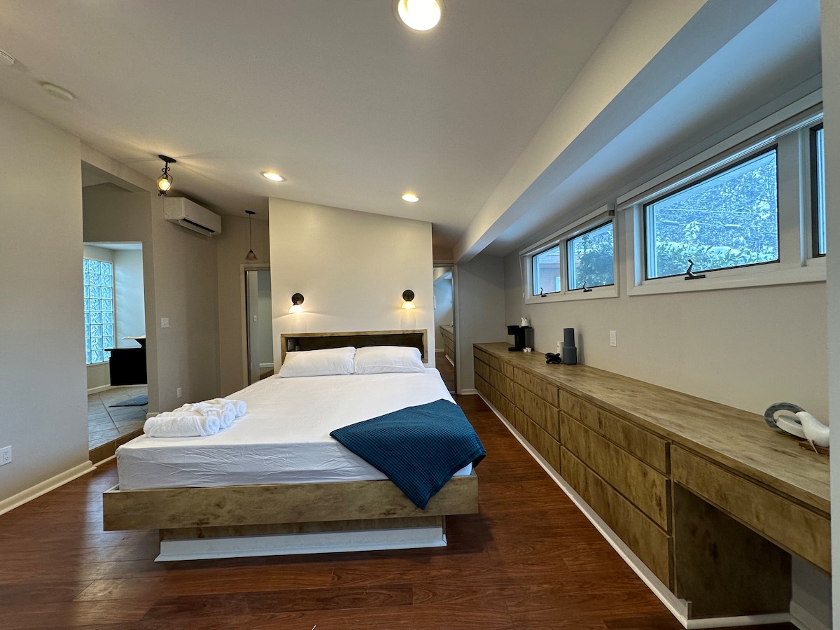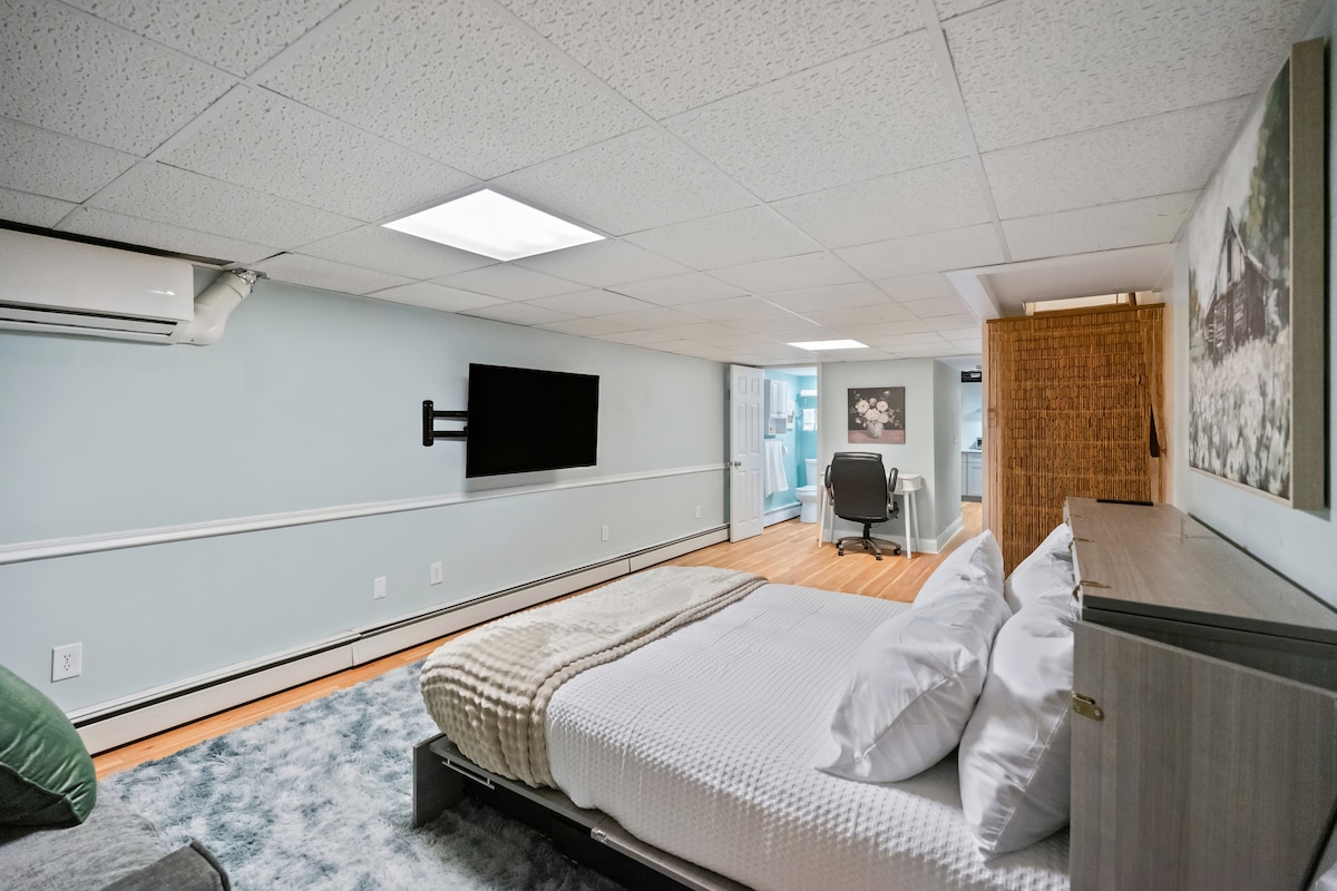Escápate a esta serena suite con entrada independiente, una extensión de la casa principal, en la zona más segura y tranquila de Baltimore. Ideal para parejas, ofrece un jacuzzi privado, una cama tamaño king californiana, un gran televisor moderno y un sistema de climatización dedicado para mayor comodidad. La espaciosa sala de estar y la lujosa ducha crean un retiro pacífico. Camina a tiendas y parques cercanos para mayor comodidad. Hay un cargador Tesla disponible bajo pedido, lo que garantiza la comodidad de los propietarios de vehículos eléctricos. Perfecto para una escapada relajante o visita a la ciudad.