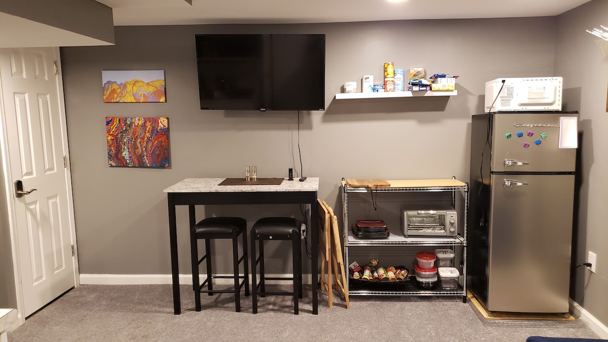 Este es un espacioso nivel inferior de una casa de nueva construcción. Esta zona privada para huéspedes cuenta con salón, comedor y cocina americana, además de un dormitorio y un baño. Los huéspedes solo comparten la entrada principal de la casa adosada con los propietarios que viven arriba. Este espacio privado decorado incluye un televisor inteligente, asientos cómodos, comedor para 4 personas, microondas, cafetera, nevera completa, tostadora/freidora de aire, cama tamaño queen, armario y cómoda. Hay lavadora/secadora disponibles bajo petición. Revisa las normas de la casa antes de reservar.