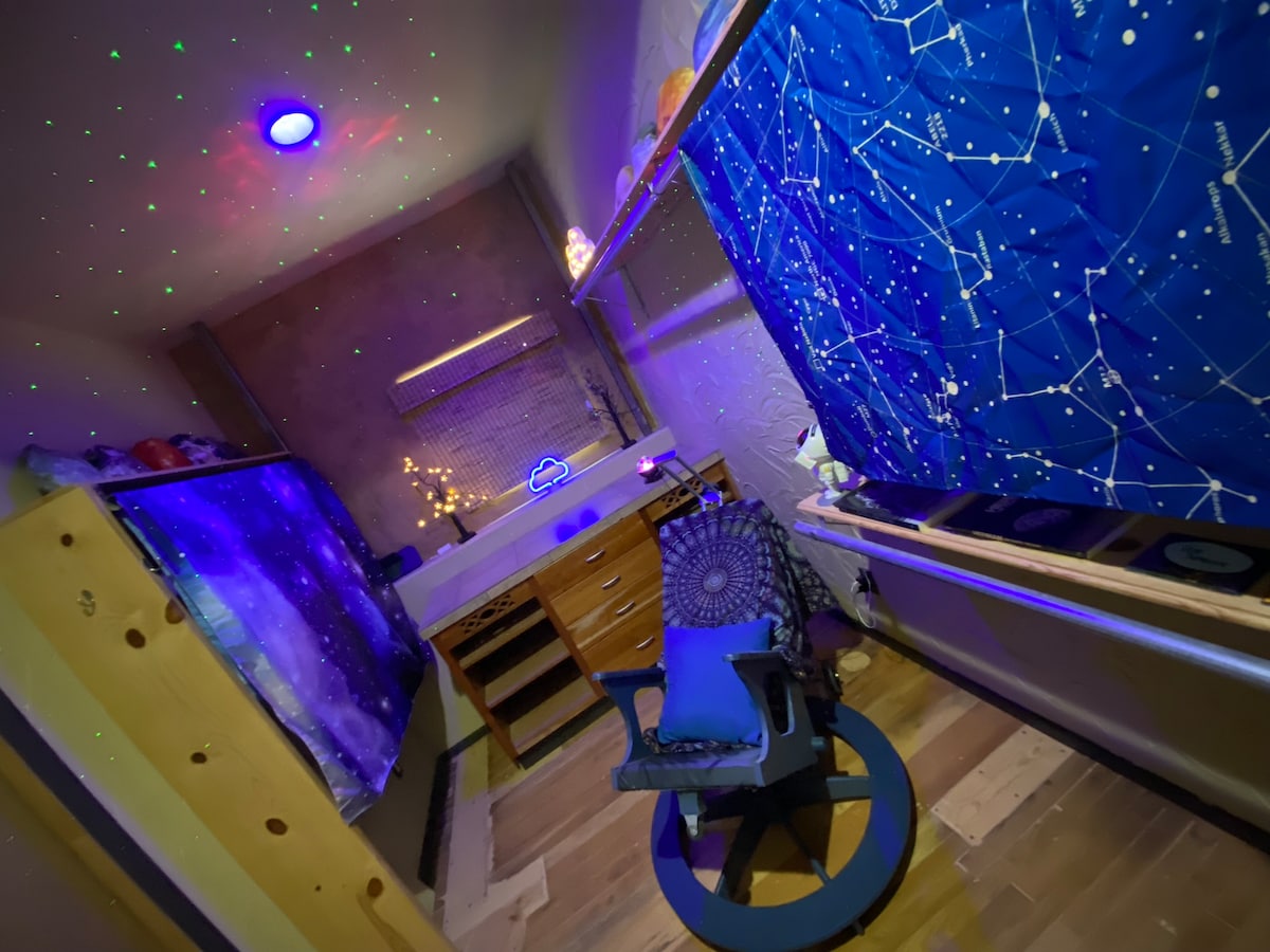 «The Duke» es un espacio de temática western inspirado en John Wayne, perfecto para una escapada tranquila a Ruidoso y ubicado en la carretera principal que lleva a la ciudad. Esta es la planta baja de nuestra casa principal que hemos convertido en «The Duke» con decoración western de John Wayne, cómoda sala de estar con mininevera, microondas y café. No te olvides de echar un vistazo al armario infantil inspirado en Harry Potter, el «armario debajo de las escaleras». Relájate cada día en la terraza cubierta de 6' por 40' escuchando el río Ruidoso que hay debajo.