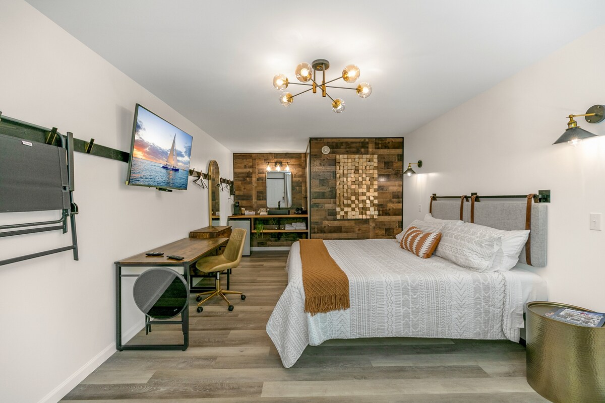 Nuestra suite King tiene las MEJORES vistas al lago de la propiedad. Se puede ver durante kilómetros a la costa opuesta, rodeado de terreno montañoso. Tiene una decoración moderna de mediados de siglo, que incluye arte de pared con temática musical, una guitarra Fender Stratocaster y un amplificador Spark para aquellos tan inclinados. Acoge hasta un televisor inteligente de hasta 50pulgadas con sistema de sonido Klipsch y chimenea eléctrica para un ambiente durante todo el año. Direct TV, internet de alta velocidad y una extensa biblioteca de DVD garantizan que nunca te aburrirás. Esta suite tiene una cocina completa.