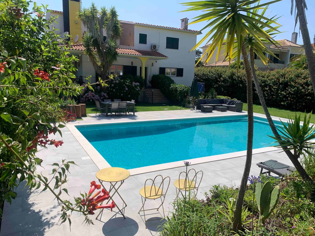 Villa para 10-12 p, zona residencial, cerca del parque forestal regional para hermosos paseos y a 3.5 km de hermosas playas, 5 dormitorios, 4 baños, jardín, piscina privada (13 x 6 m), gran sala de juegos (billar, futbolín), 2 barbacoas, golf (3 km), 25 km de Lisboa y aeropuerto. Gran cocina y terraza. Huerto detrás del anexo Aparcamiento privado. Si estancia de más de 7 días: tarifa de limpieza cobrada por semana