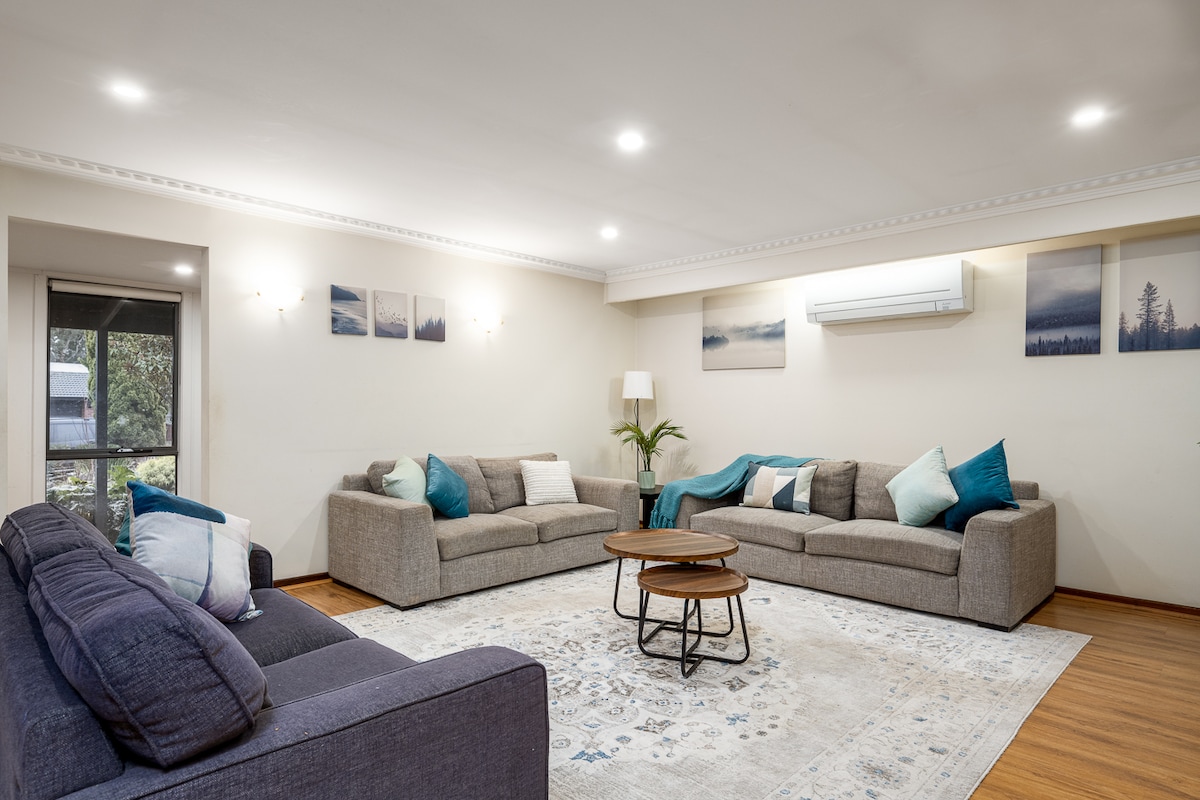 Amplia, elegante e ideal para familias o grupos, nuestra moderna casa de 3 dormitorios y 2 baños ofrece comodidad y privacidad en un entorno tranquilo. Disfruta de un espacio abierto, dos salones con televisores inteligentes, una cocina totalmente equipada, un área de estudio independiente y un amplio patio trasero con un patio exterior cubierto equipado con parrilla Weber y chimenea. Cerca de parques, mercados, campos de golf y a solo 6 km de Westfield Fountain Gate. Tu base ideal para explorar Melbourne y sus alrededores.