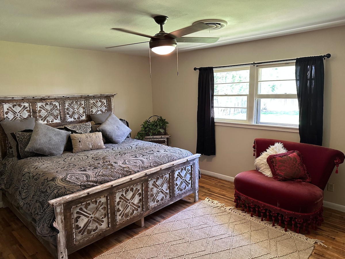 Escápate a tu propio oasis privado y deja la ciudad atrás. Esta impresionante casa se encuentra en 7 acres con 4 dormitorios y 3 baños completos. Hay un dormitorio en el sótano disponible al reservar 6 huéspedes o más. Relájate en los lujosos muebles de cuero mientras ves tus programas favoritos en los televisores inteligentes de 55 pulgadas. Sal y disfruta del amplio patio con barbacoa y 3 encantadores porches perfectos para impresionantes amaneceres y puestas de sol. La cocina totalmente abastecida es el lugar ideal para hospedar y entretener a los huéspedes.