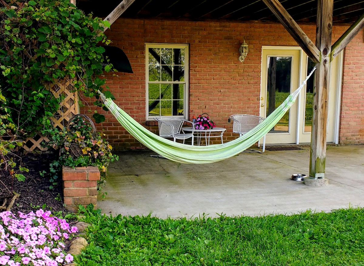 ¡Bienvenido a Country Living! Vivimos en un terreno sereno de 12 acres en el país a pocos minutos de la I-70 (salida 79 E con destino/salida 85 W con destino). Ofrecemos un apartamento limpio y acogedor en el nivel inferior con entrada privada, 2 dormitorios/1 baño, cafetería/cafetería con una variedad de refrigerios, té y café, una sala de estar, sofá reclinable, mesa de billar, chimenea eléctrica, RokuTV, mesa pequeña/2 sillas y un área de patio al aire libre. Estamos ubicados en una granja familiar de 250 acres con un sendero para caminar, bosques, arroyo y cabaña.