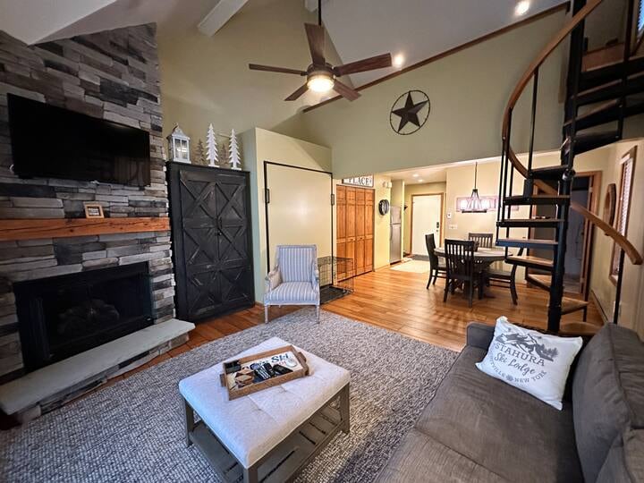 ¡Hermoso y moderno apartamento de 2 dormitorios y 1 baño perfecto para una escapada con amigos o un divertido fin de semana en familia! **25 % de descuento para reservas SEMANALES** Equipado con todas las comodidades del hogar, incluidas sábanas, utensilios de cocina, chimenea de gas, lavadora y secadora y un televisor en cada habitación. El sofá cama crea suficiente espacio para que se alojen 6 personas. ¡Ubicado a solo 1 milla del pintoresco pueblo de Ellicottville y a 2 millas de las pistas!