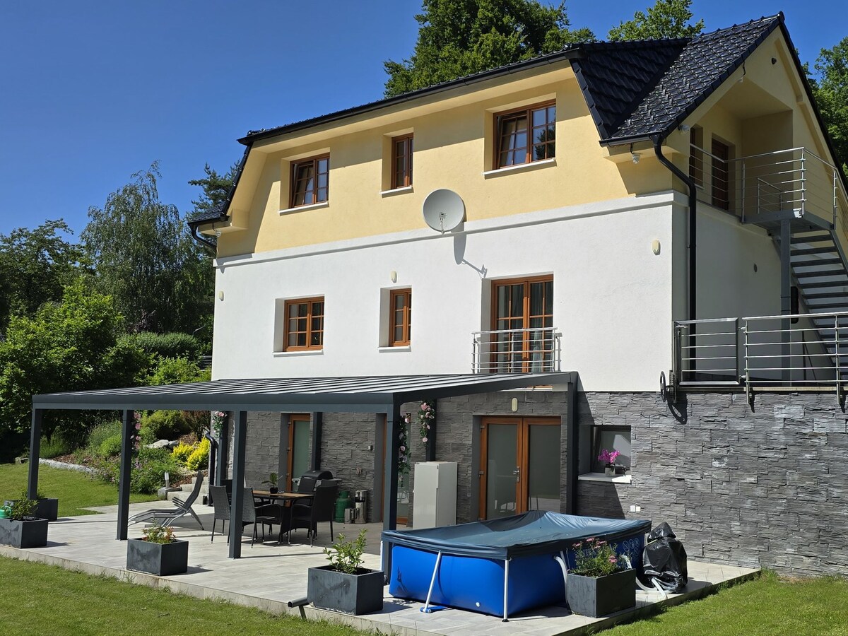 🍀Relájate en una moderna casa de campo con aire acondicionado, terraza con muebles de relajación, una bañera de hidromasaje de lujo (60 minutos al día GRATIS) o en la piscina (solo en verano), una hamaca, junto a la chimenea, bajo una pérgola bioclimática con muebles de comedor, mientras haces una barbacoa en un hermoso jardín de 1600 m², los niños disfrutarán de un gran parque infantil. Compartes 🫶 la piscina y el jardín con nuestra familia: nuestra casa y la casa rural de Airbnb están una al lado de la otra. ❤️ Para parejas, familias y amantes de los perros Centro de Praga: 20 minutos. Aquapalace Čestlice – 10 min. Westfield Chodov – 20 minutos Zoológico - 35 min