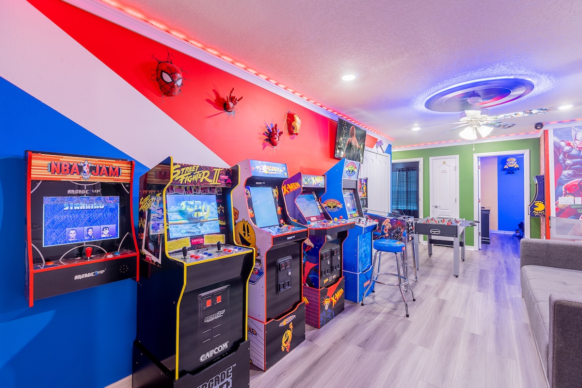 Orlando, Disney, sala de juegos, cine, sillón de masaje, piscina, jacuzzi, 2 camas tamaño king, litera para niños, Kissimmee. Sala de juegos mejorada en la casa privada, cine para las noches en casa y tu lanai privado con piscina y jacuzzi. Elige entre Pump It Up Dance, Sponge Bob Racing, NASCAR Racing, Legends 3, Pac-Man's Arcade Party, un televisor de 80 pulgadas y una Xbox 360. Mira tus películas favoritas en la pantalla de proyección de 92 pulgadas, con sonido envolvente y asientos estilo estadio.