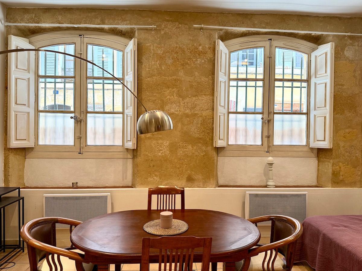 El apartamento está situado en la calle Rue Cardinale, una de las calles más bonitas de Aix-en-Provence, en el corazón del distrito de Mazarin, en una ubicación tranquila cerca de tiendas y de las principales atracciones culturales de la ciudad. Este es un departamento con carácter con techos altos y muebles de época. Está en el segundo piso con ascensor y se beneficia de una doble exposición, aire acondicionado y todos los servicios.